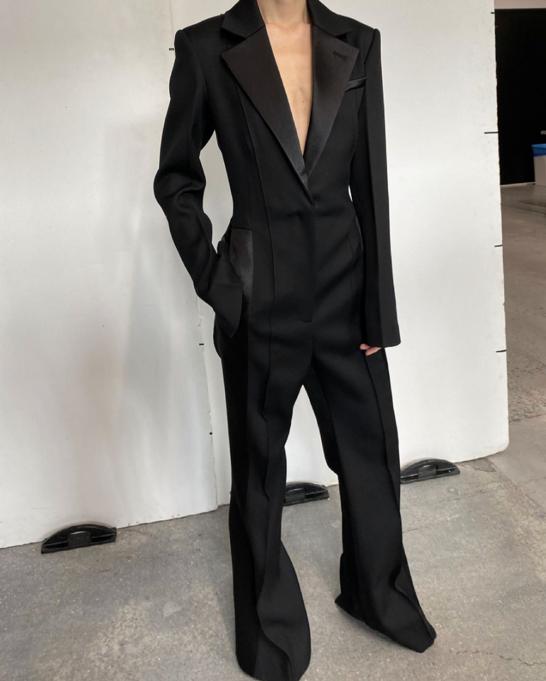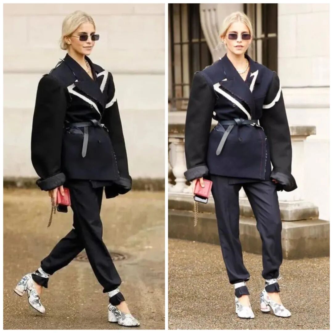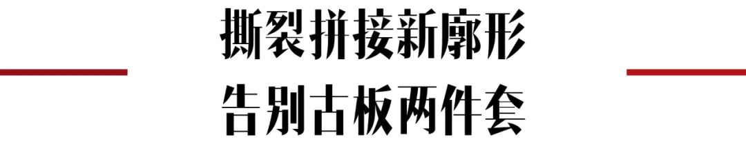 从黑白面料拼接而成的西服领到挽起的袖口,从裤脚处与高跟鞋相结合的绑带设计到上衣领部暴露的毛边,这套西装造型让我们领略到了西服与西裤在设计与穿搭上的全新可能。