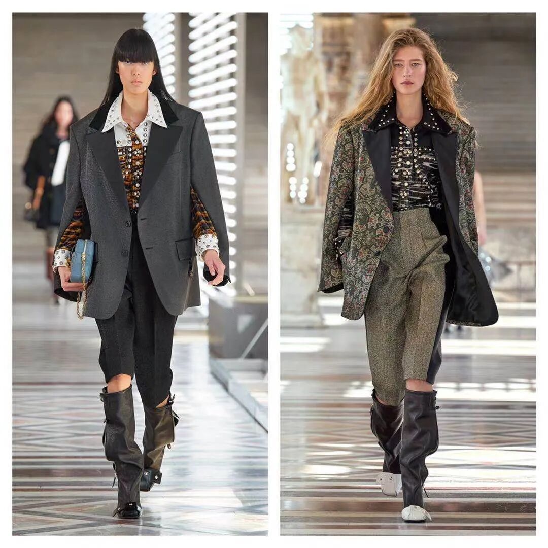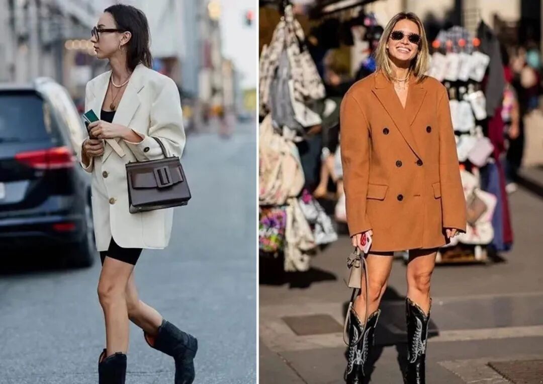 带有垫肩的宽大西服与黑色紧身短裤可以在廓形上形成强烈对比,于视觉上打造出一种身材娇小的感觉。黑色长筒靴的融入既修饰了腿部线条,又为整体风格增添了几分性感与妩媚。
