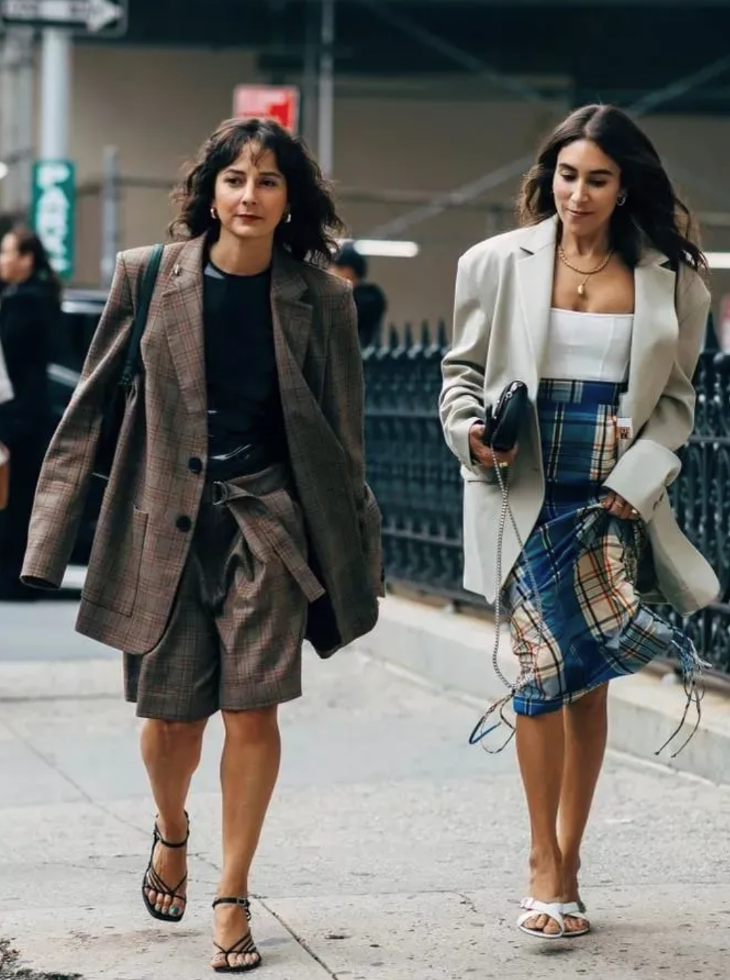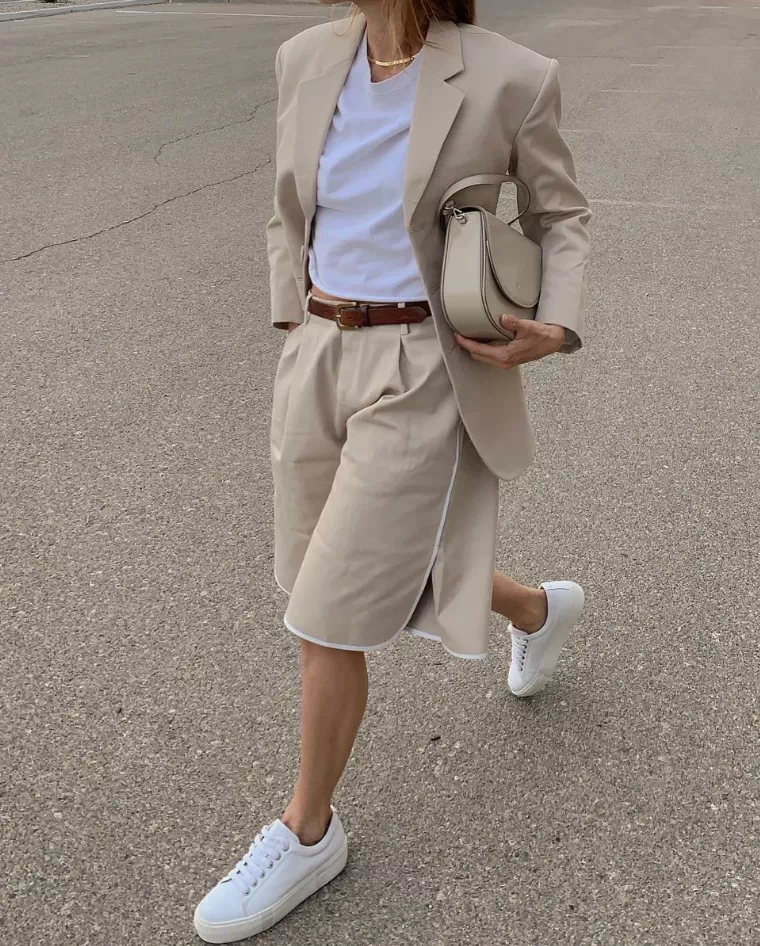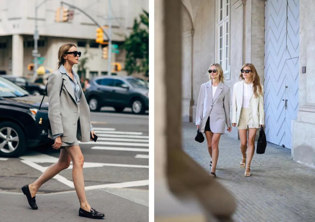 纯色西服与宽松短裤套装具有不容忽视的整体感,干净利落又不失温柔气质。低饱和度且高明度的色彩与短至膝盖以上的西裤搭配,加之深色墨镜的映衬,当为春日出街首选。