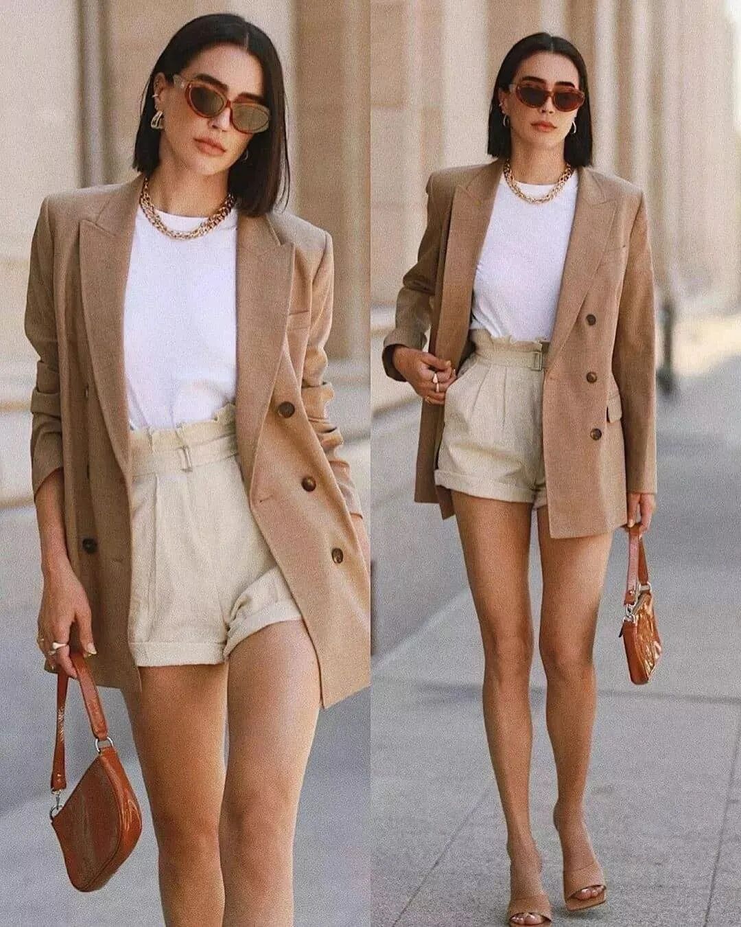 浅褐色西装搭配米色高腰短裤,在拉长腿部线条的同时塑造出干净利落的形象。颈部的金属项链与包袋链条相呼应,墨镜的红色边饰与手提包颜色相近,一系列暖黄色调的运用调和了整体色彩,层次分明而又不失高级感。