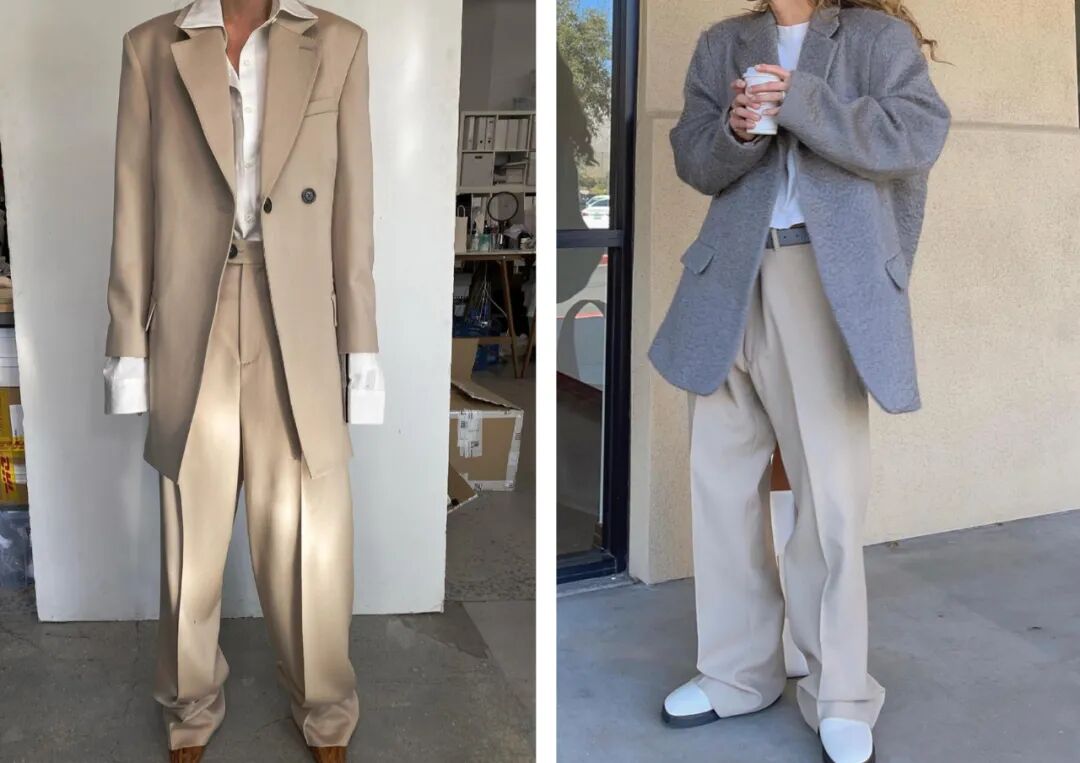 卡其色宽松西服套装内搭乳白色衬衫,袖口处外露的衬衫袖边与裤脚处堆叠的西裤面料相呼应,取得视觉上的平衡。灰色毛呢西装与杏色长裤的搭配冷暖有秩,诠释出慵懒舒适之感。