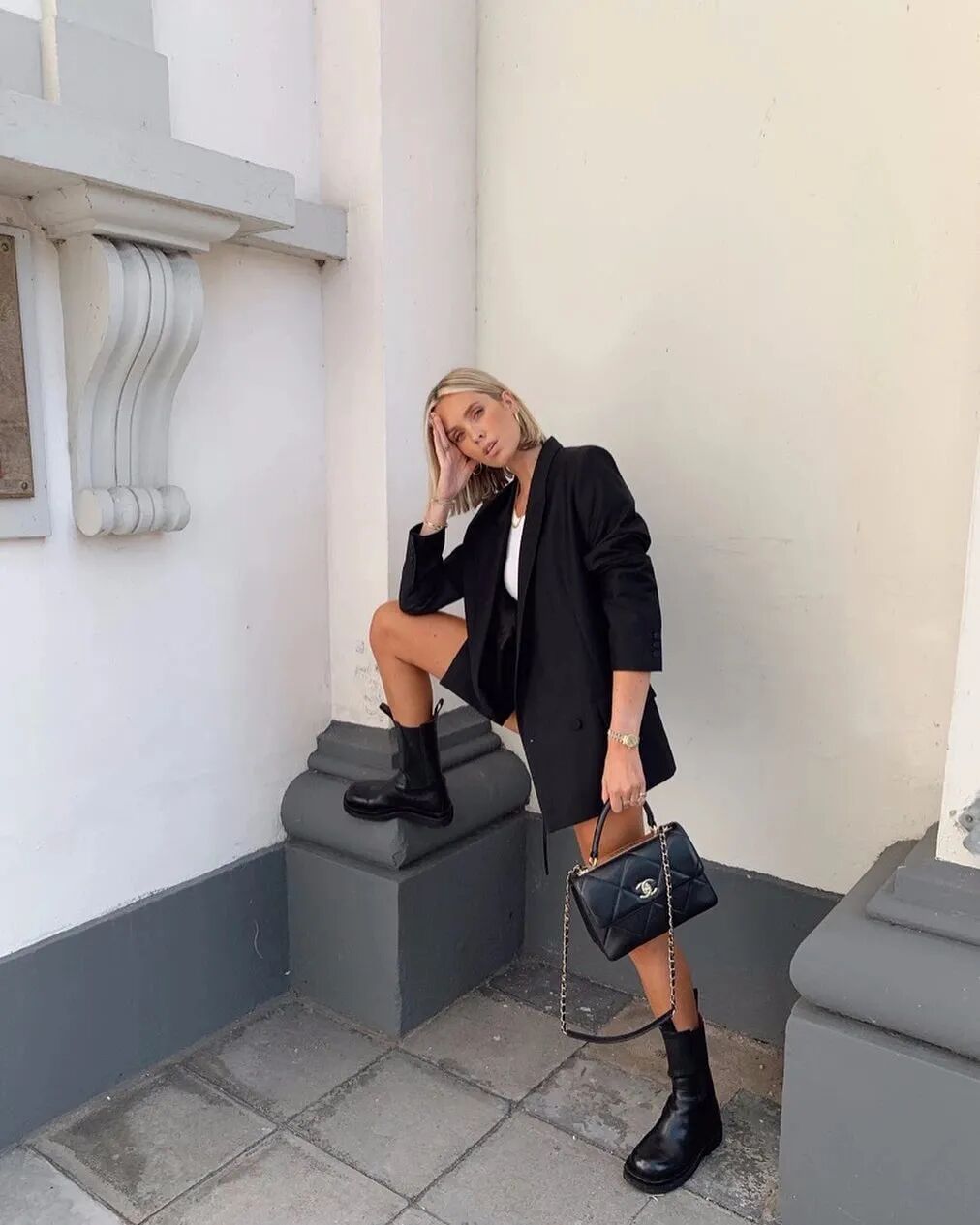 all black西服套装搭配同色挎包与长筒靴,诠释出俏皮性感的cool girl形象。白色内搭若隐若现,与外套及超短西裤形成对比,是修饰身材的绝佳穿搭。