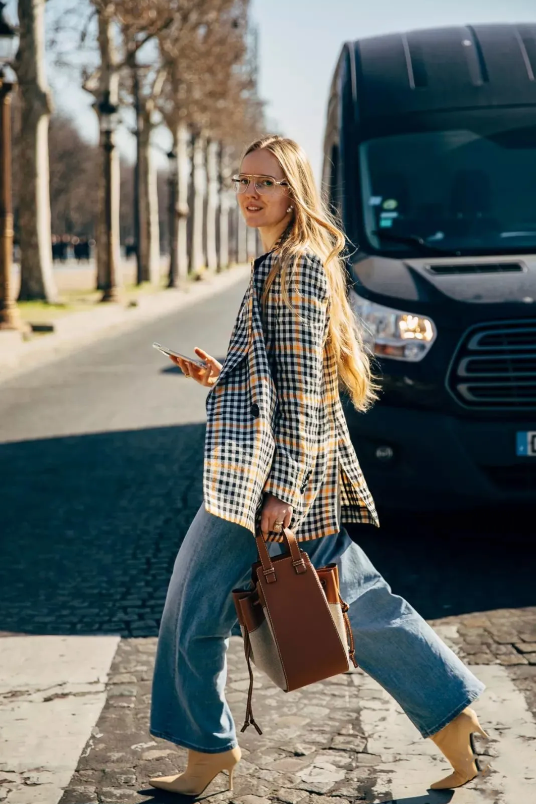 这一套黑黄格子西装与阔腿牛仔裤的搭配看上去洒脱而又浪漫,取一抹鹅黄置于脚下,色彩丰富又无凌乱感。在选择非纯色西装与牛仔裤搭配时,为避免色彩的繁复,适当从图案中提取部分颜色用作鞋帽配饰,与上衣形成对应,是很好的搭配方式。