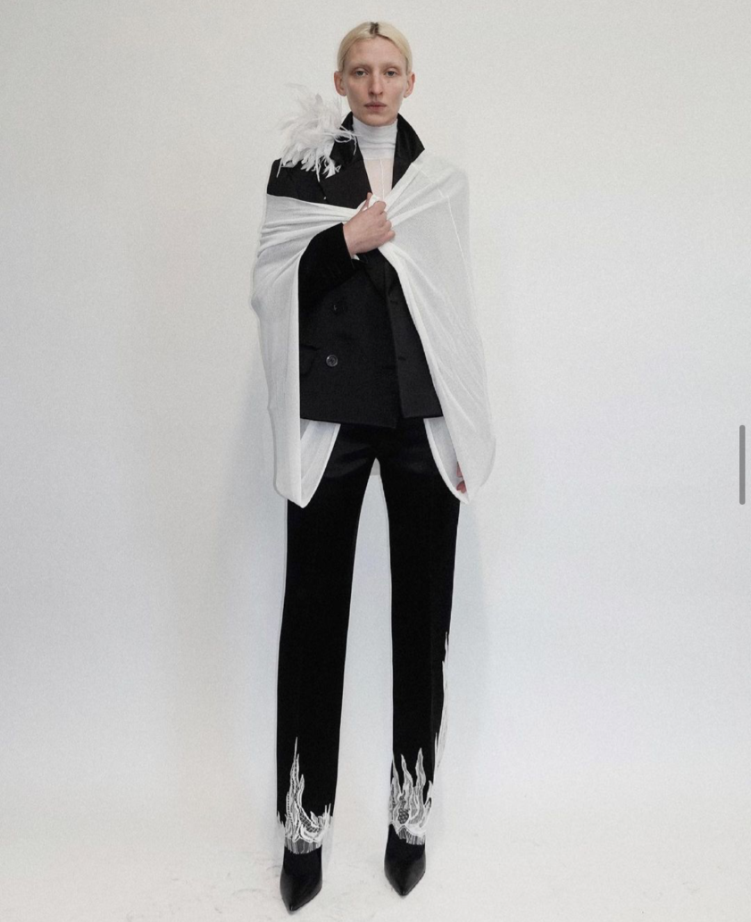 这套黑色西装的亮点在于裤脚处的白色蕾丝拼接图案,火焰般的轮廓简洁而精致,比例掌控得恰到好处。