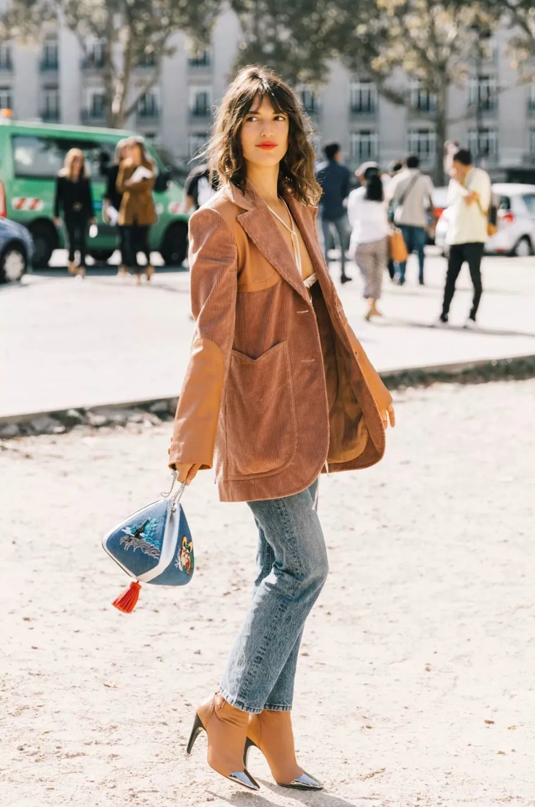 黄色系条绒拼接西装搭配水洗牛仔长裤,设计感满满。在西服套装风靡全球的当下,适当选择具有小细节的设计,定会增加回头率。