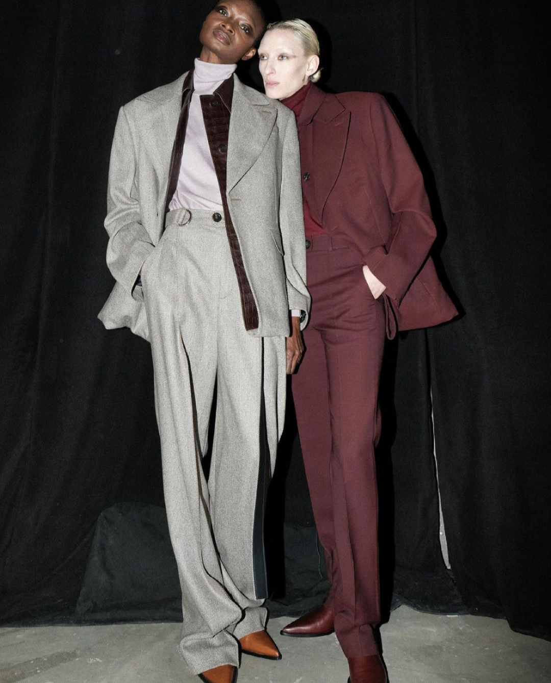 浅灰色与酒红色西服外套内分别配有白色及暗红色高领内搭,一套完美的闺蜜装令人眼前一亮。于裤脚处若隐若现的暗橘色尖头单鞋与深褐色衬衫的点缀别具一格,你与潇洒极简少女之间只差一套西装!