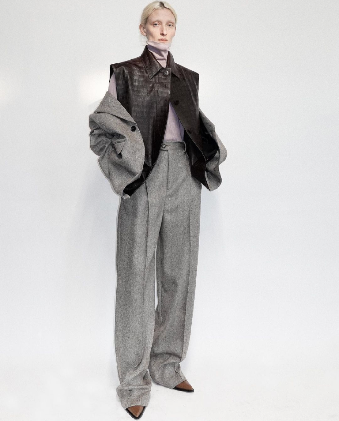 柔美的灰紫色高领内搭与深褐色皮夹克为这套纯灰色西服套装赋予了一抹高级感。肥大拖地的裤脚与尖头单鞋堪称绝配,二者在形态上相互调和,几何形态的单鞋削减了裤腿的累赘感,取得了视觉上的和谐。