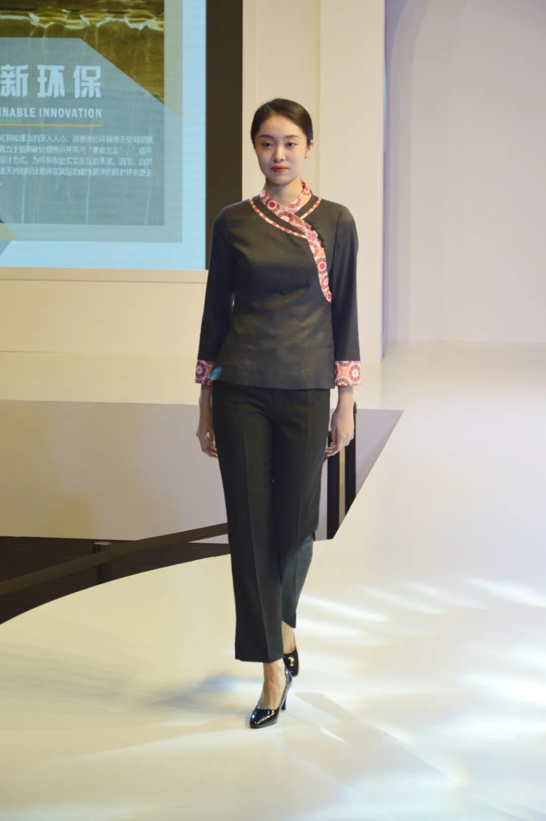 “国潮态度”指将传统中式美学结合青年文化来在当前时代背景下的演绎,酒店将传承中式风格的精髓,通过与现代潮流的对话碰撞而产生的创新。因此,新中式风的酒店职业服设计将结合中式审美,以现代化的艺术手法,赋予职业服设计以新的含义。这一主题的关键词是文化、新中式和融合。设计上以交领、盘扣、斜门襟、中式半袖等中式元素设计细节结合衬衫、西装等西式廓形诠释简约大气的新中式风。此外,国潮禅意主题下的面辅料传递出质感与功能兼具的特点,如麻棉混纺、天丝等面料,其卓越的湿气管理功能、自然舒适和柔软亲肤等特点,打造功能与经典外观相融合的新式东方韵味。