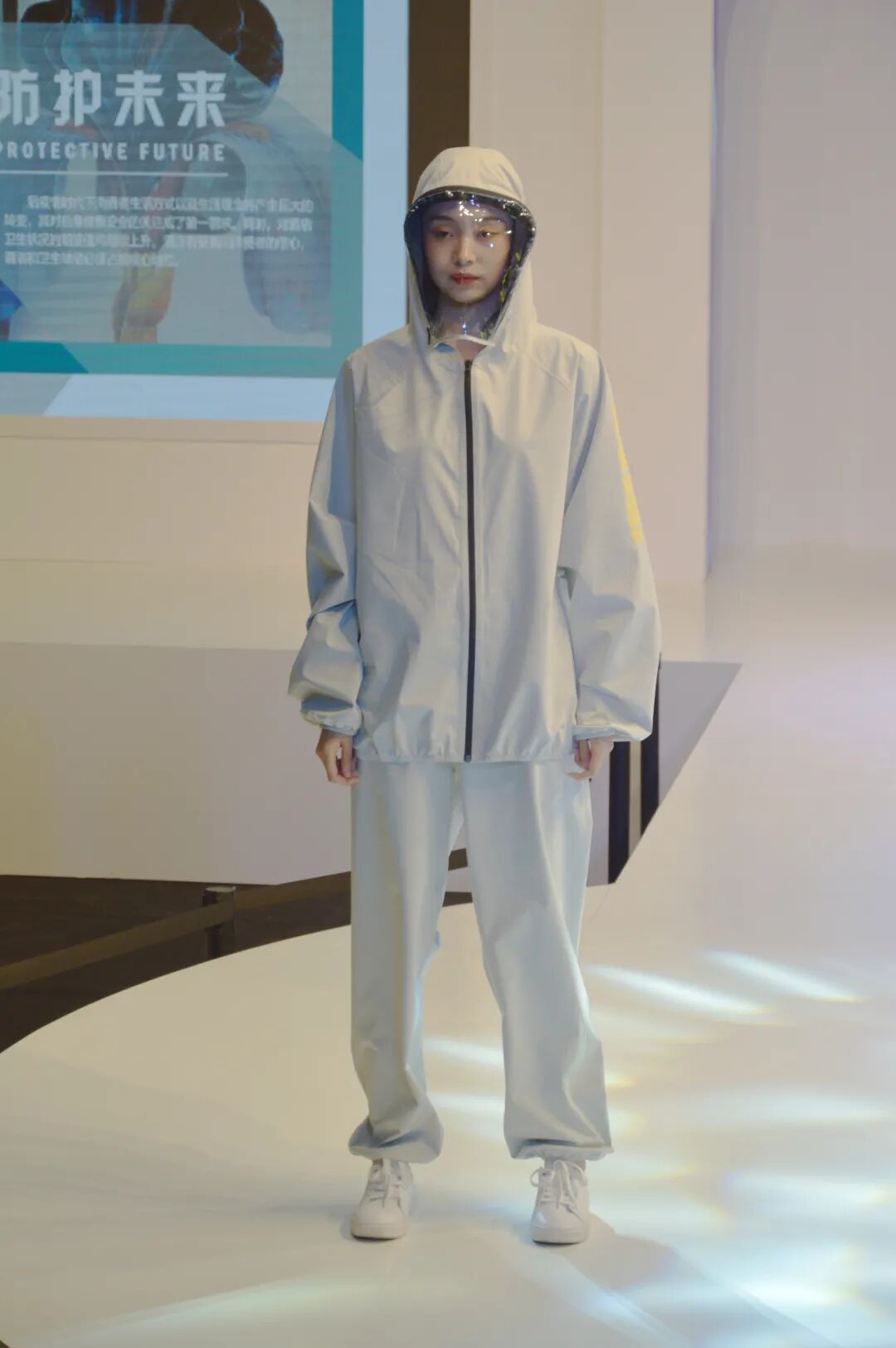 “防护未来”主题强调的是酒店职业服的科技化与防护性。后疫情时代下消费者生活方式以及生活观念将产生巨大的转变,其对自身健康安全的关注成了第一需求。同时,对酒店卫生状况的期望值将继续上升,酒店若要赢回消费者的信心,清洁和卫生举措必须占据核心地位。这一主题下,职业服将从款式、面料、工艺等多个层面融入防护功能。如面辅料使用抗菌面料、保健修护面料、抑菌拉链等;工艺上使用抗菌涂层、功能性印花;款式融入可拆卸部件与可调节结构,结合现代感分割、反光镶边织带等,在满足实用功能性的同时为服装增添科技质感。