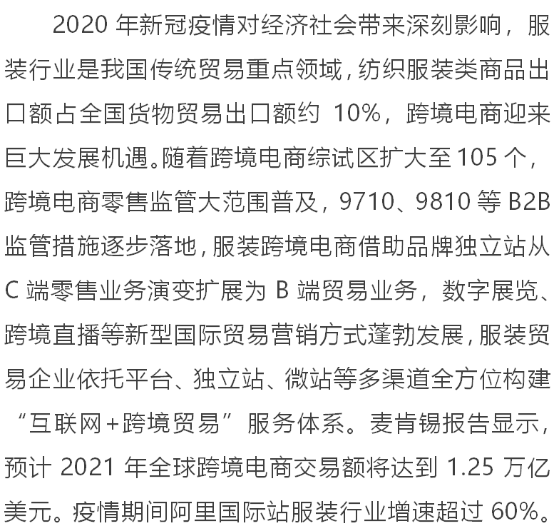 新冠疫情推动了在线经济服务形态快速发展,直播电商已全面渗透服装产业链,直播带货、B2B直播、生产直播等新业态新模式层出不强,将引领服装电商发展新常态。