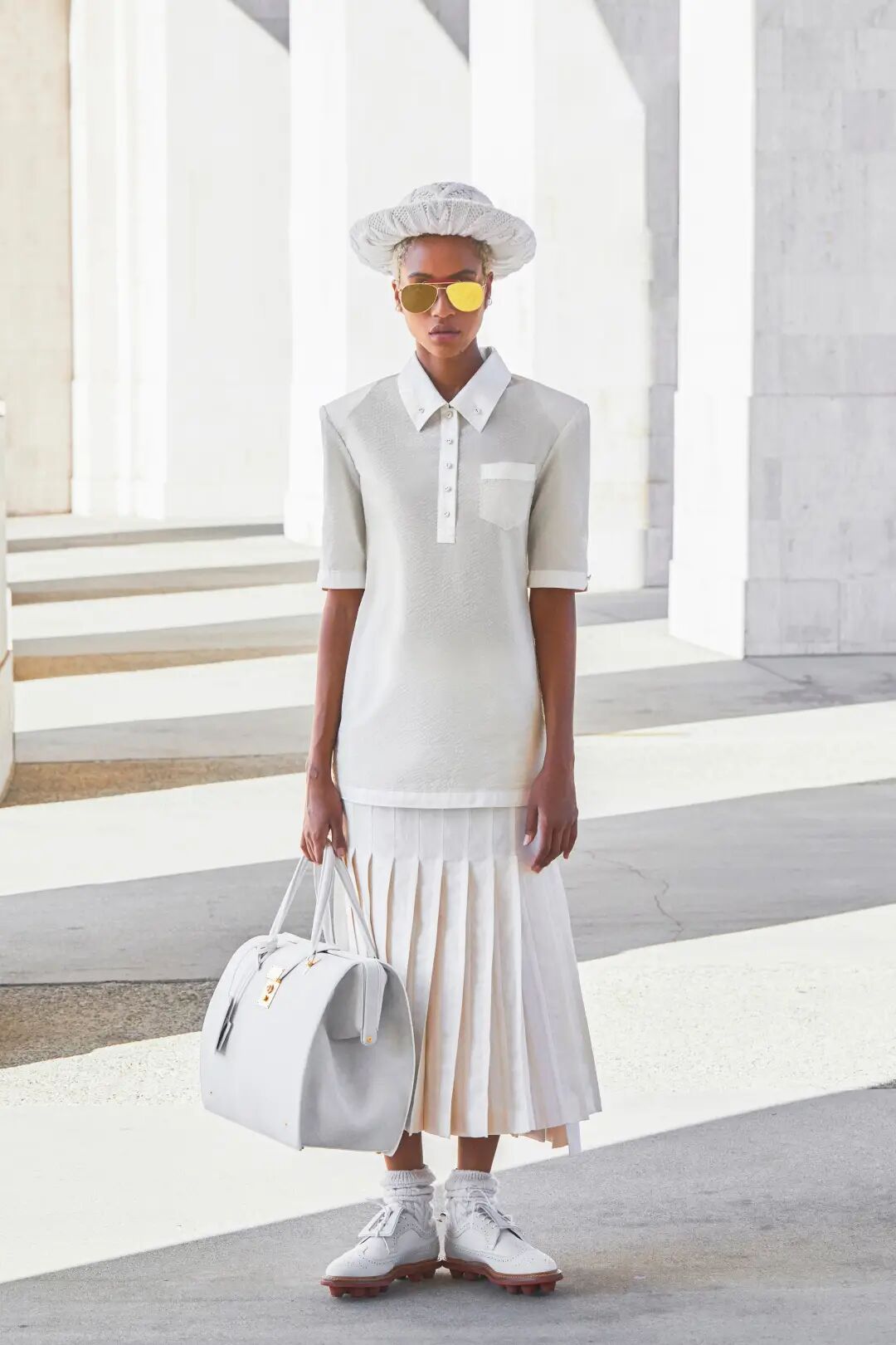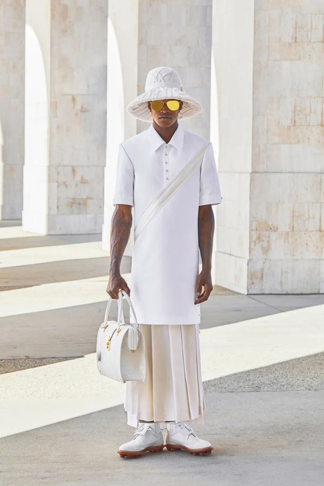 常见于制服上的百褶元素,翩然降临2021年春夏时装周,THOM BROWNE就以20年代运动服为灵感,在2021年春夏系列采用了百褶裙元素,干净的纯白色贯穿整体百褶时装,不过此次品牌也将该元素附加以男性轮廓身上,整体虽然带有运动风,但同时也能感受到量身定制的高级感。