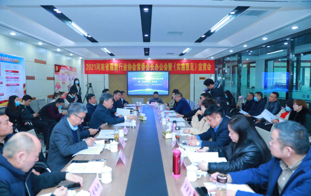 3月10日上午,2021河南省服装行业协会常委会长办公会暨河南省人民政府办公厅《关于促进服装产业高质量发展的实施意见》宣贯工作会议在郑州若宇服饰公司召开,河南省服装行业协会会长李刚等协会领导,陈勇斌、赵孙立、刘涛、赵志纯、陈秀娜等常委会长,李伟、张新华等专业委员会会长出席了本次会议,会议由河南省服装行业协会常务副会长张勋主持。