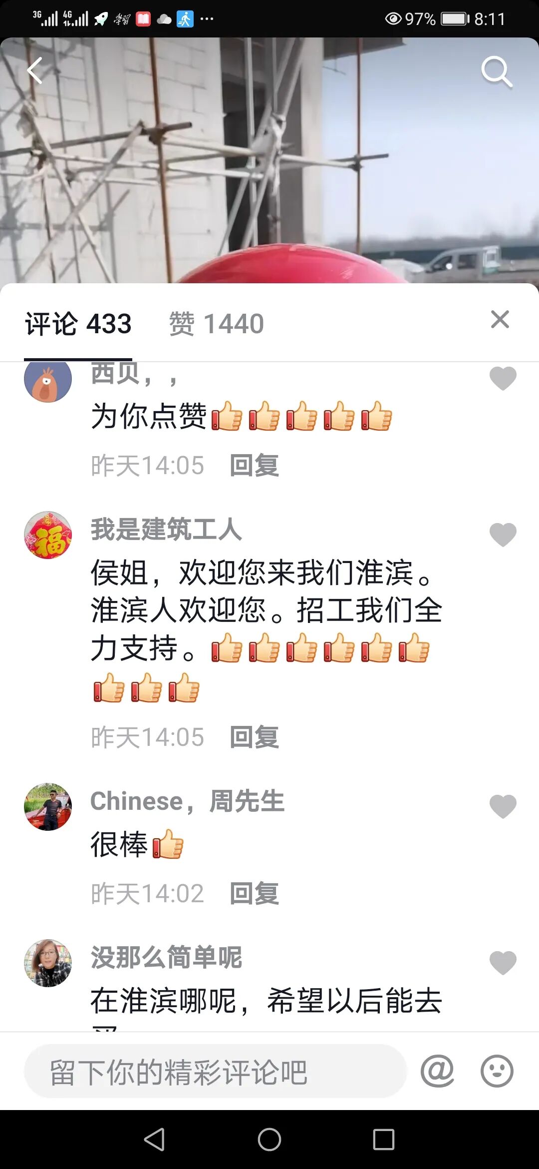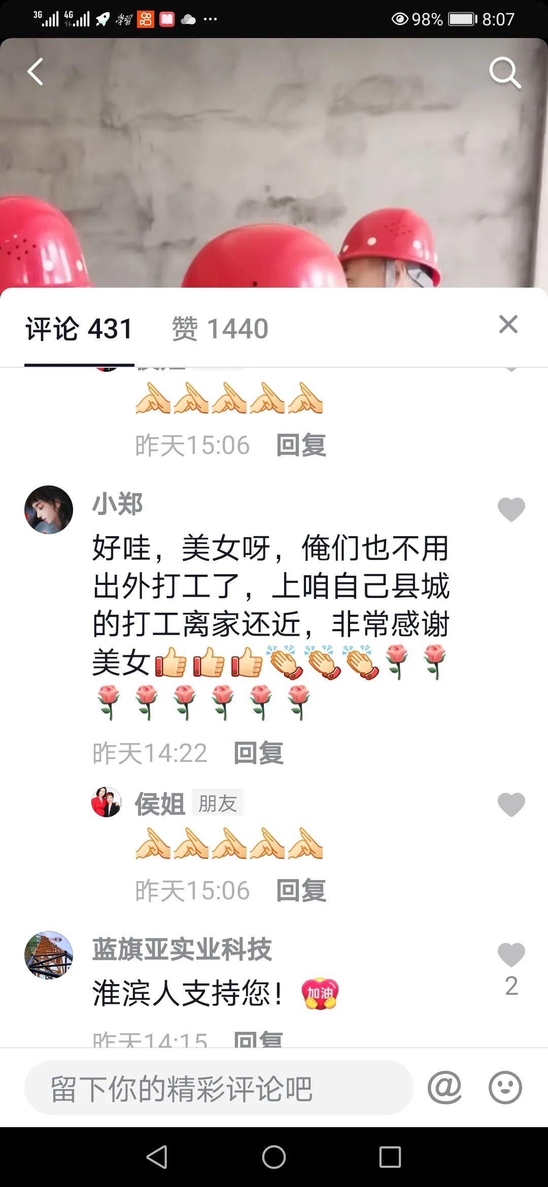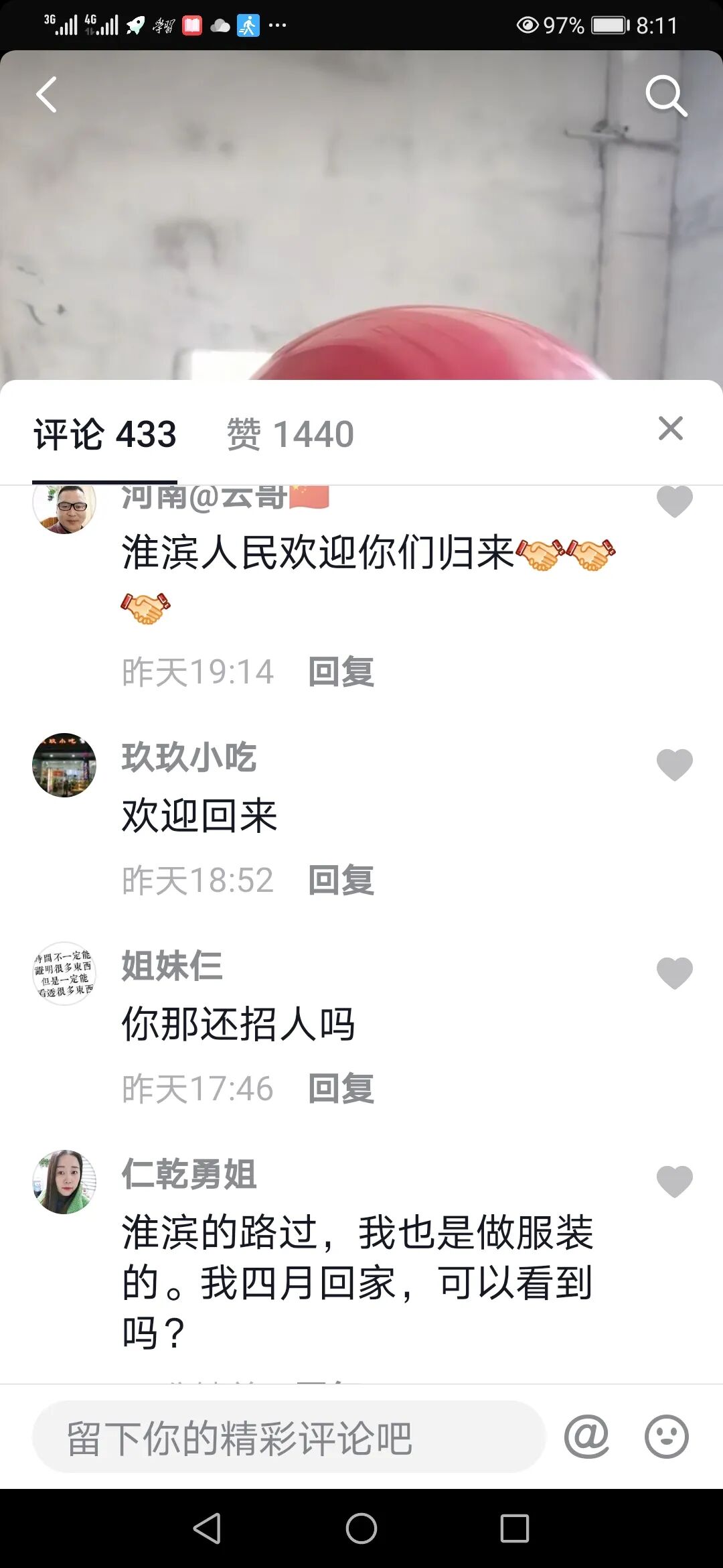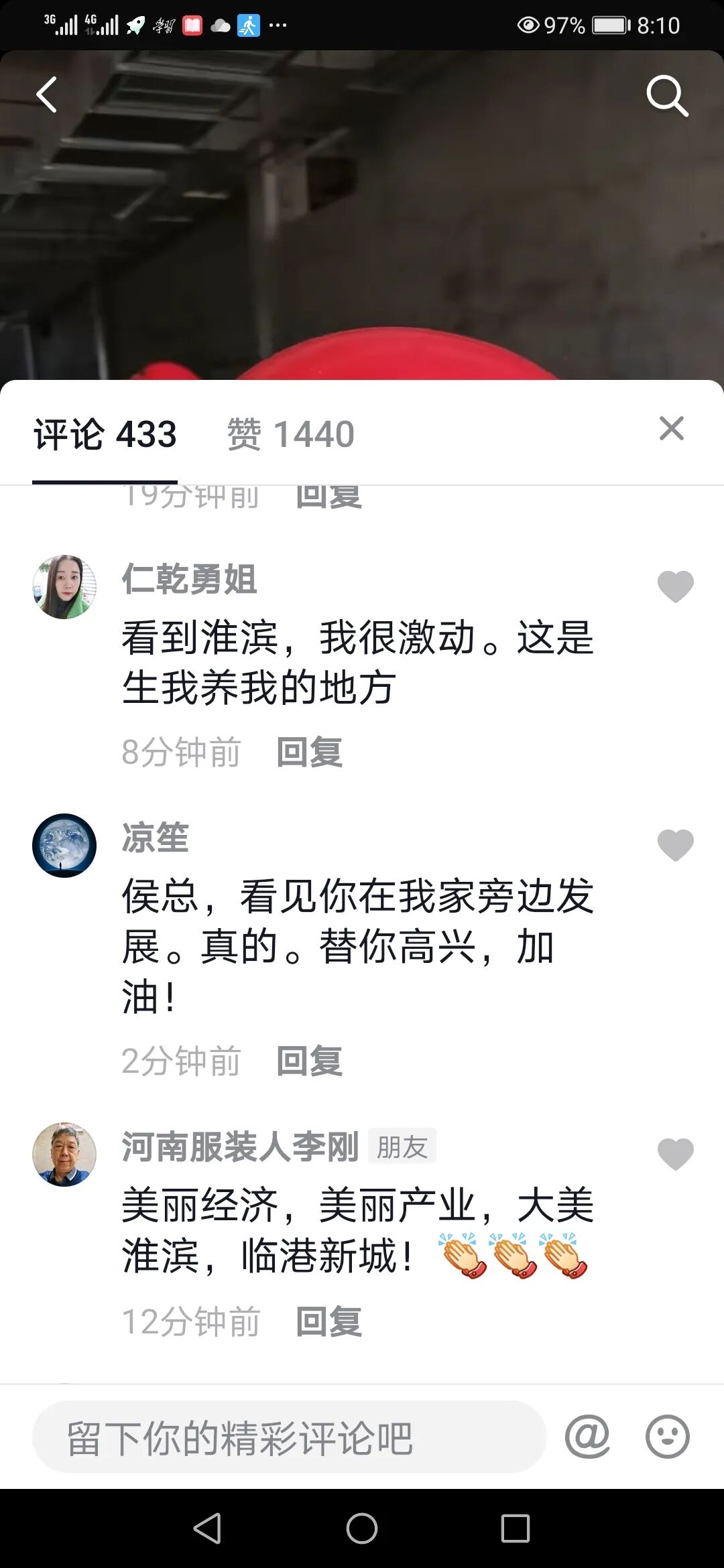 没有精心准备的剧本,也没有华丽震撼的剪辑和特效,视频一经发布,在短短48小时内,播放量超过6万,2600多人点赞,评论量达到1000多条。网友们纷纷为侯总送来祝福和支持,不少淮滨人表示愿意到临港服装城上班,希望淮滨服装产业能发展的越来越好!河南省服装行业协会会长李刚也发表了评论,他写到,美丽经济,美丽产业,大美淮滨,临港新城!对项目给予充分肯定和赞扬!