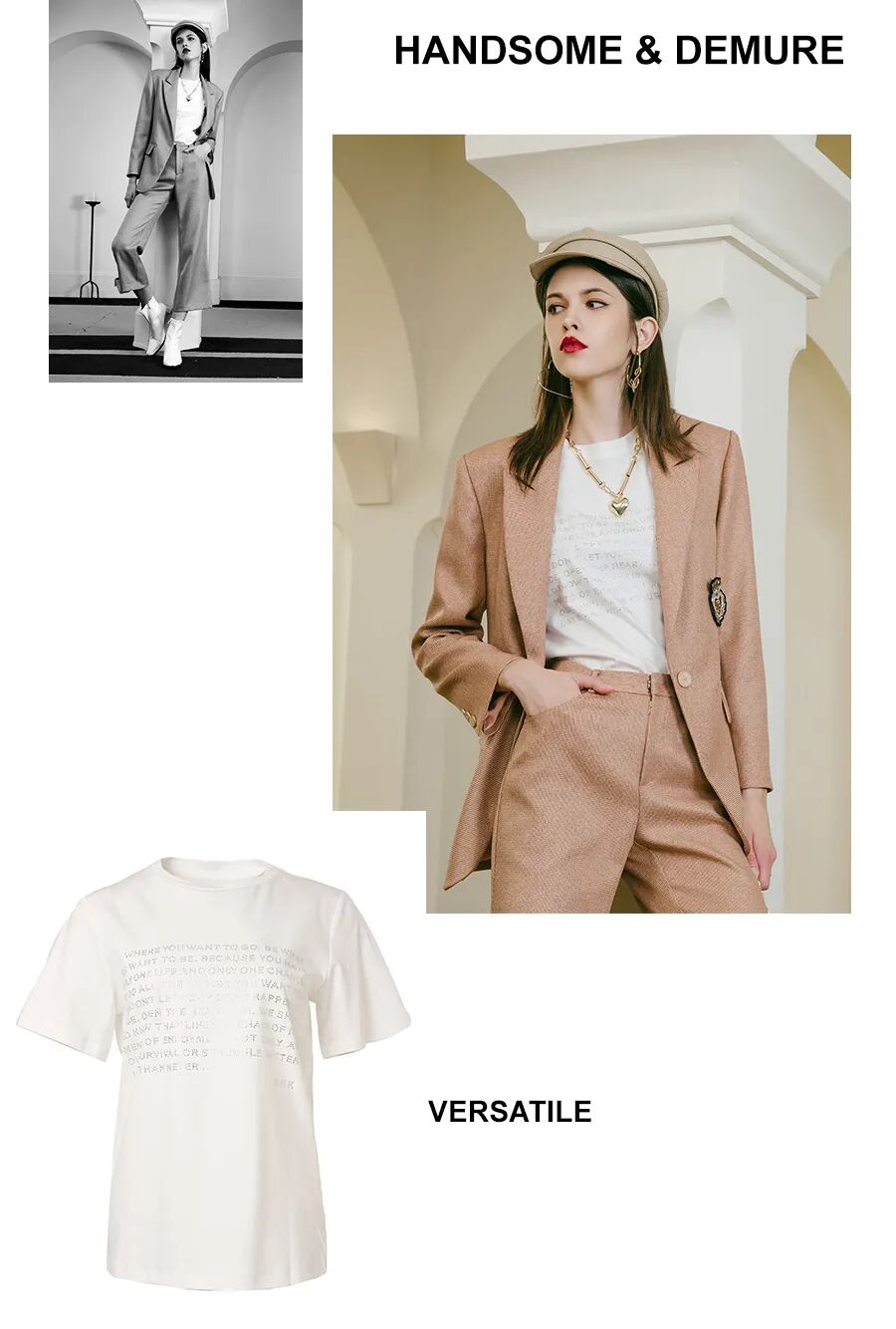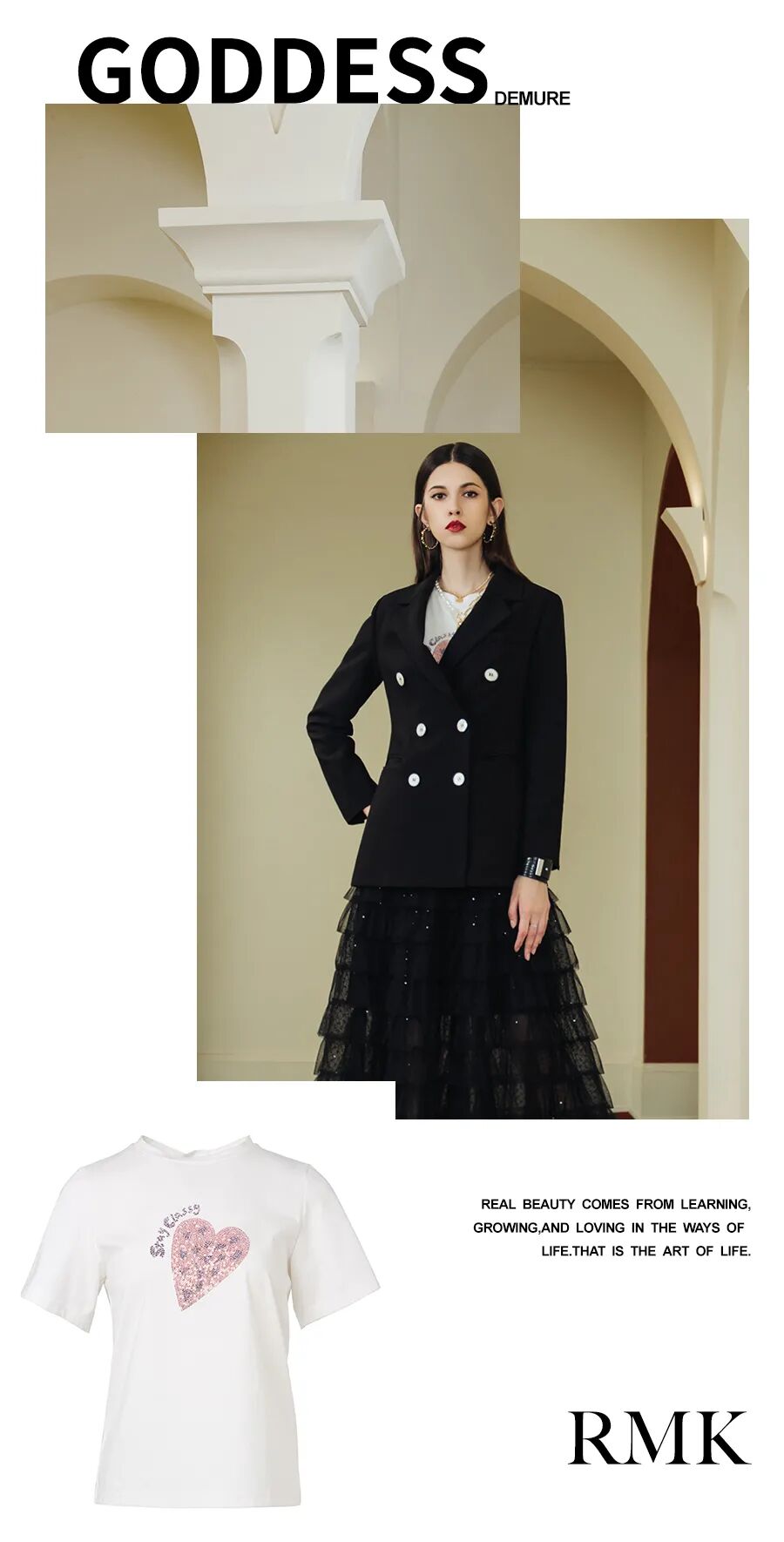 高级又不失温和感的西装外套对各类身材都很友好,加持前卫又不失格调的原创印花纯棉T恤和若隐若现的网纱裙,轻松打造摩登高级LOOK。