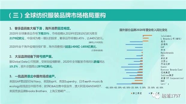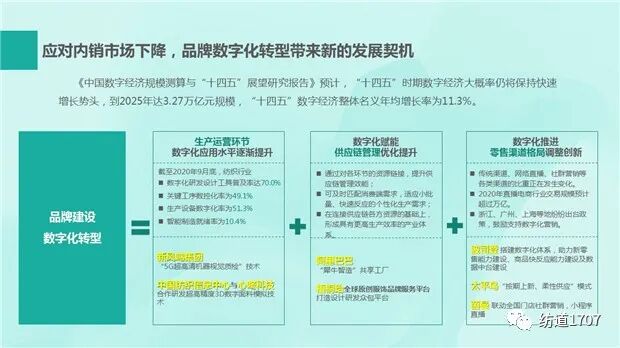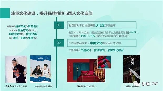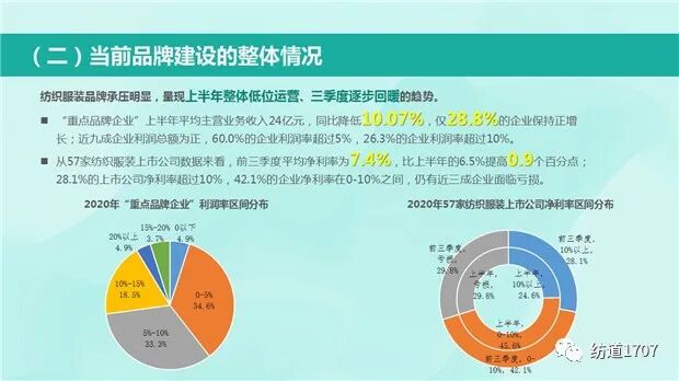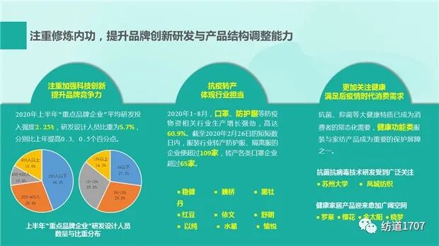 纺织全行业品牌建设体系已基本形成。受疫情影响,2020年纺织服装品牌承压明显,经历了上半年整体低位运营、三季度逐步回暖的过程。面对新形势,纺织服装品牌积极进行数字化转型,坚持科技创新,关注健康消费,加强文化建设,提升引领消费与增强文化自信的能力。