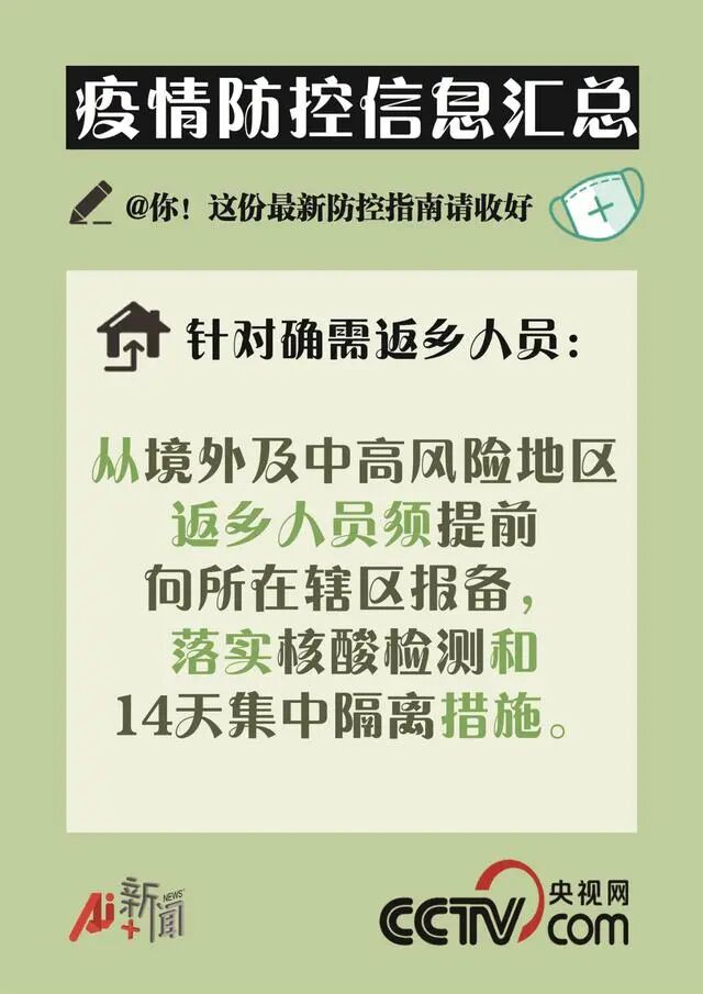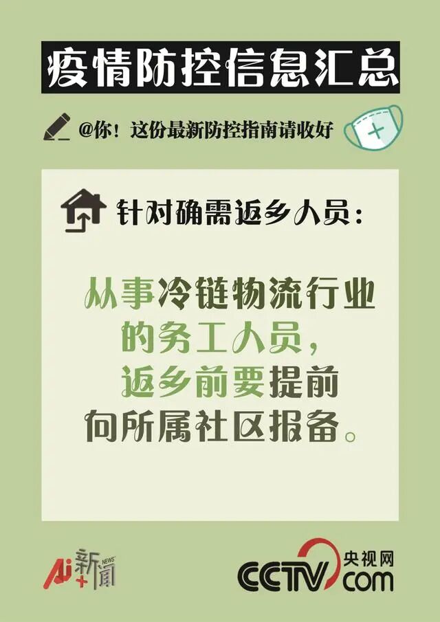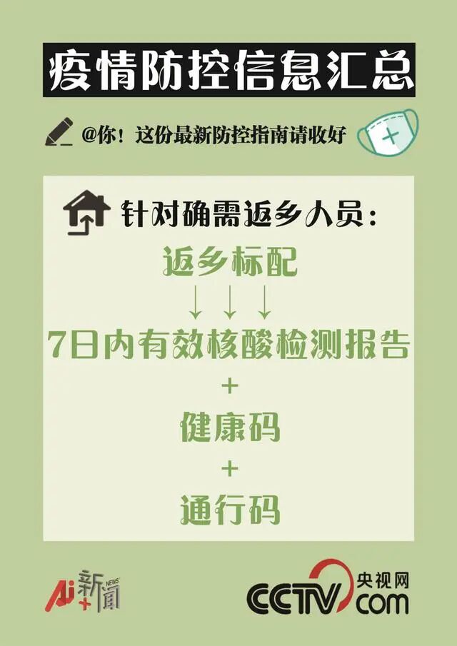(一)坚持非必要不返乡。建议留在务工(工作或学习)地过年,可以用微信、网络、电话等方式拜年。如确需返乡,返回时要携带7日内核酸检测证明并提前3天向所在村(社区)报备,在返乡途中要注意安全,戴好口罩,保持社交距离,到家后配合村(社区)做好返乡人员信息登记和健康监测工作。未做核酸检测的及时到当地医疗机构进行核酸检测,检测结果未出前要居家健康观察,发现异常及时报告。返回后尽量不走亲串友。(二)坚持非必需不外出。如非必要,不要前往境外和国内中高风险地区。确需外出,请提前向所在社区(村)、单位报备,妥善保存车票等以备查询。(三)坚持非必需不聚集。春节期间,尽量不要前往人员密集和密闭场所,提倡婚丧嫁娶等人员聚集性活动停办、缓办或简办,尽量减少聚餐。家庭私人聚会聚餐等控制在10人以下,做好个人防护,有流感等症状尽量不参加。(四)坚持非必须不网购境外食品商品。尽量到正规商场、超市购买冷链、海鲜等食品,购买时应查验追溯证明、入境货物检验检疫证明、核酸检测证明、消毒证明等“四证”,挑选冷冻冰鲜食品应使用一次性塑料袋反套住手,避免用手直接接触。建议不网购进口冷链食品,非必须不网购境外物品。(五)坚持健康生活方式。勤洗手,实行分餐公筷,不食生冷食物,处理食材应注意生熟分开、煮熟煮透,保持1米以上社交安全距离,家庭和工作场所要勤通风、勤消毒、勤打扫。科学规范佩戴口罩,尤其是在乘坐公共交通工具、电梯和在公共场所活动时。咳嗽、打喷嚏时注意遮挡。(六)坚持做好自身健康监测。若出现发热、咳嗽、胸闷等症状时,第一时间向村(居)委会报备并及时到发热门诊就诊,如实向医务人员告知外出旅居史及人员接触情况,配合好疾控机构调查。预防胜于救治,多一分用心,少一分风险。希望会员企业继续弘扬伟大抗疫精神,主动履行社会责任,保护自己,关爱家人,筑牢防控堡垒,打好疫情防控阻击战!衷心祝愿各会员单位和全体员工过一个快乐祥和的春节,祝广大行业同仁身体健康、平安幸福!共迎新春到来!