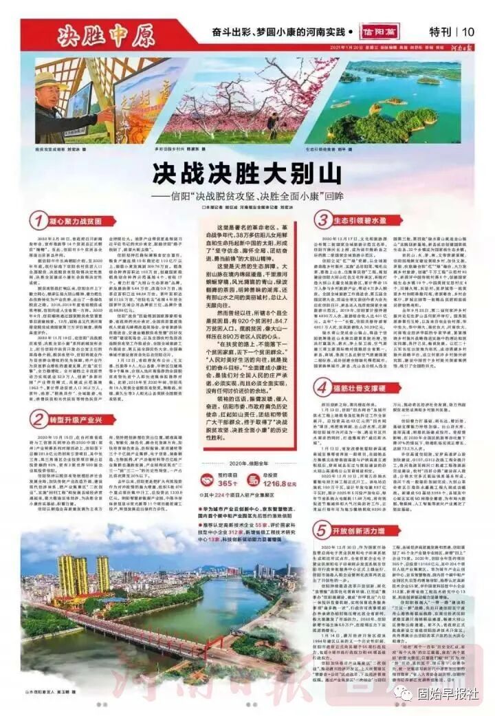 “十三五”收官,信阳交出了一份沉甸甸的答卷:8个贫困县全部摘帽,920个贫困村全部出列,累计脱贫84.7万人;生产总值稳居全省第9位;粮食产量连续十年保持在110亿斤以上;环境空气质量长期居全省第1位;公铁水空多式联运体系基本成形;县区中心城区实现5G网络全覆盖;出山店水库、明港机场、息邢高速等重大工程建成投用,许信、安罗高速和G107、G312改线加快建设;绿色发展之路越走越宽,成功创建全国文明城市、全国绿化模范城市、国家森林城市,美丽乡村点缀在大别长淮之间……
