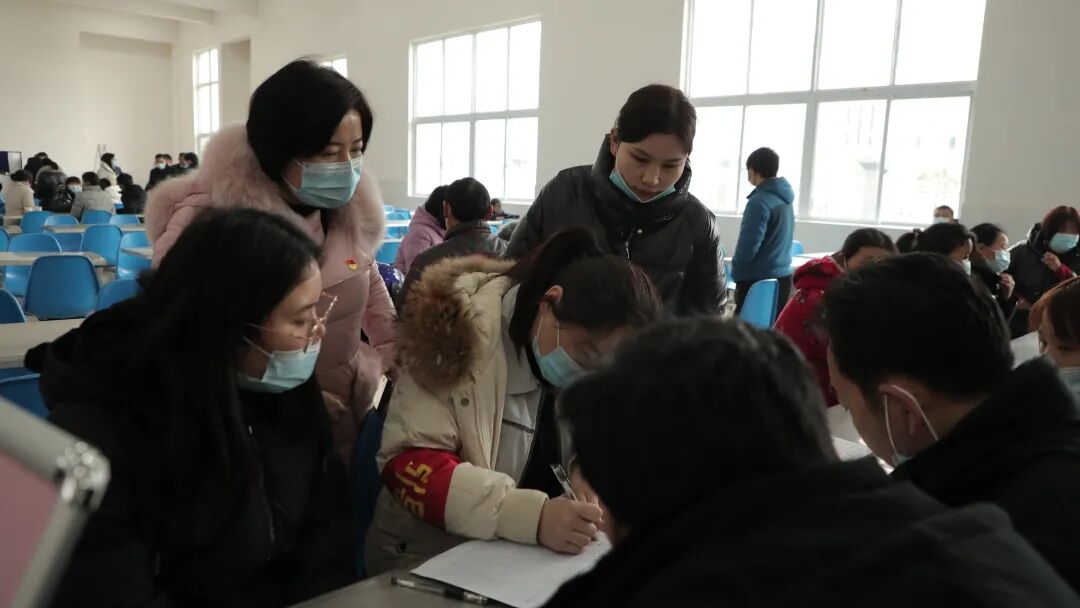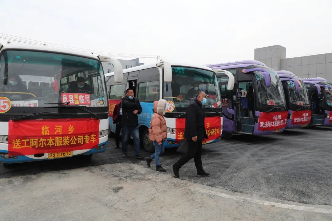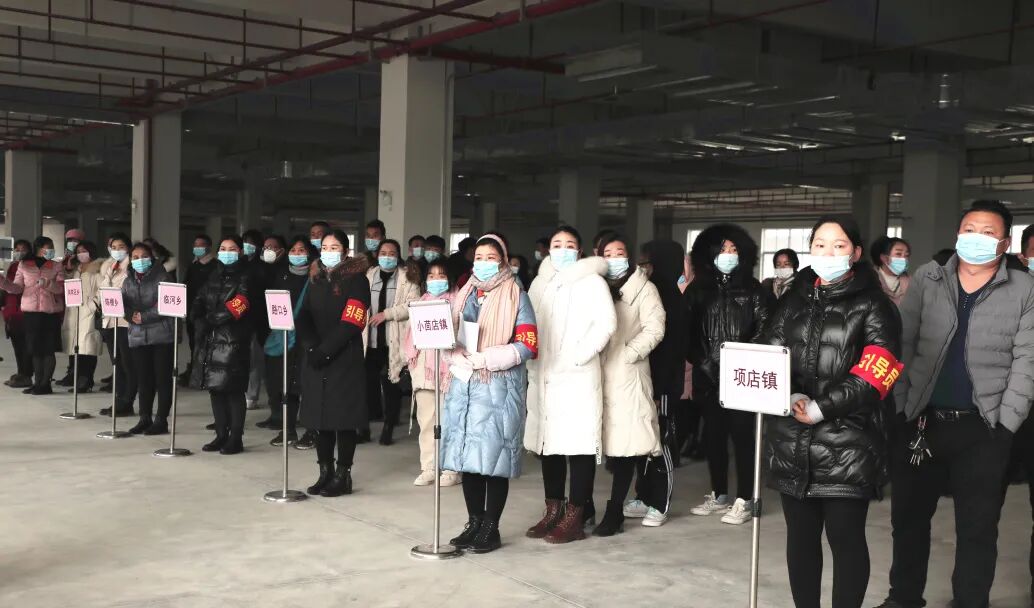 上午9时,各乡镇的送工车辆依次开进阿尔本(息县)服装科技有限公司大门口,前来报到的员工下车,随着负责的引导员排队进入等候大厅。