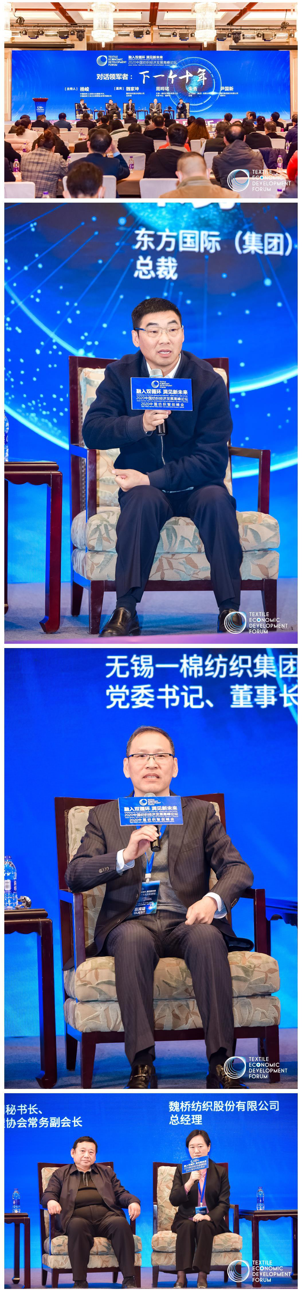 同时,还举行了 “对话领军者:下一个十年”的现场座谈 。无锡一棉纺织集团董事长周哗珺、 东方国际(集团)有限公司总裁朱勇、晨风集团股份有限公司董事长尹国新、魏桥纺织股份有限公司总经理魏家坤参与对话座谈。