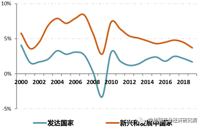 图1:2000~2019年发达和发展中国家GDP增长情况