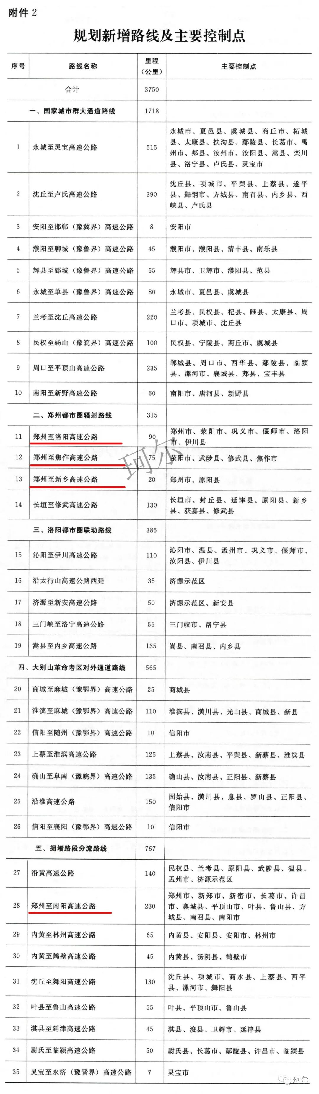 看一个地区未来的发展,就看它的路网:无论是高速路还是快速路亦或者高速出入口规划预留,因为这将提高片区内的通达性;为加快构建河南综合立体交通网络,适应区域协调发展要求,更好发挥高速公路的基础支撑和先导引领作用,联通其他城市群,服务郑州、洛阳都市圈等地,以实现与其他运输方式有机衔接、建设现代综合交通运输体系,全面适应经济社会高质量发展新要求,必需构建安全、便捷、高效、绿色、智慧的高速公路网。日前,河南省人民政府关于印发河南省高速公路网规划(2021-2035年)的通知,规划期限及方案如下:(一)规划期限。规划期至2035年,远期展望至2050年。(二)规划方案。按照“拓展省际出口、提升通道能力、完善路网覆盖、强化枢纽功能”的基本思路,在2016年高速公路网规划总里程10050公里的基础上,进一步完善高速公路网布局,规划新增路线3750公里,规划总里程达到13800公里。(三)规划布局。全省高速公路网总体采用纵横通道和联络线相结合的布局形式,由16条南北纵向通道、16条东西横向通道和6条省会联络线组成,总规模约13800公里,省际出ロ68个,基本实现“市市有环线、县县双高速、乡镇全覆盖”。©河南省高速公路网(2021-2035)规划路线示意图-来源官网一、规划新增路线共35条、3750公里,按照功能划分为5大类:1、国家城市群大通道路线10条、1718公里;2、郑州都市圈辐射路线4条、315公里;3、洛阳都市圈联动路线5条、385公里;4、大别山革命老区对外通道路线7条、565公里;5、拥堵路段分流路线9条、767公里。解读:通过新增线路分布来看,主要针对高速路网稀疏区域和重点城市及城市圈展开,充分衔接已有路网,形成贯穿河南境内的东西和南北向高速路网。特别是新规划的郑州至南阳的高速线路,在上一版征求意见方案中并没有体现,此次纳入2035规划中,对于中原城市群南部高效生态经济示范区的南阳节点来说,是个大利好。其次就是洛阳城市圈的大环线高速路网,启动建设后,将助力对洛阳城市圈各组团间的联动和融合。©河南省高速公路网(2021-2035)扩容改造路线示意图-来源官网解读:通过此次扩容线路分布来看,更多地是服务省内核心城市间的通行,逐步形成客货分道,提高通行能力,实现规划有机衔接,积极对接航空、铁路、水运、邮政、枢纽等,构建立体互联的综合交通运输网络,加强与核心城市组团、产业节点和枢纽节点的衔接,提升服务保障能力。3、在已建成高速公路规划新增出入口154个;其中郑州都市圈新增34个、郑州全域新增14个。©河南省高速公路网(2021-2035)新增出入口示意图-来源官网
