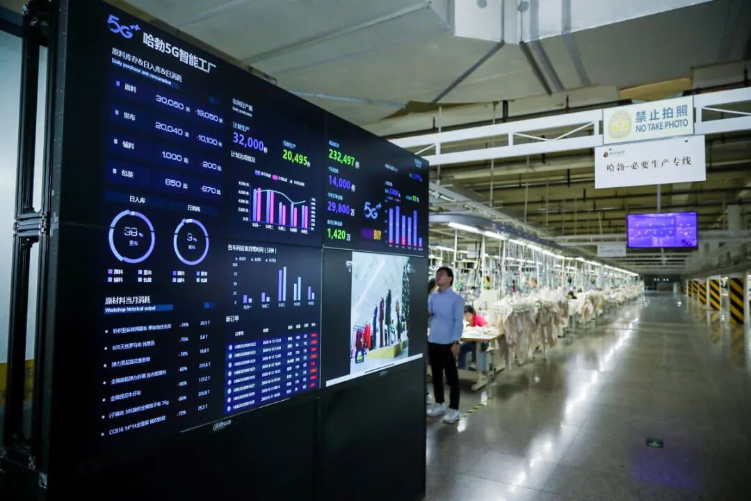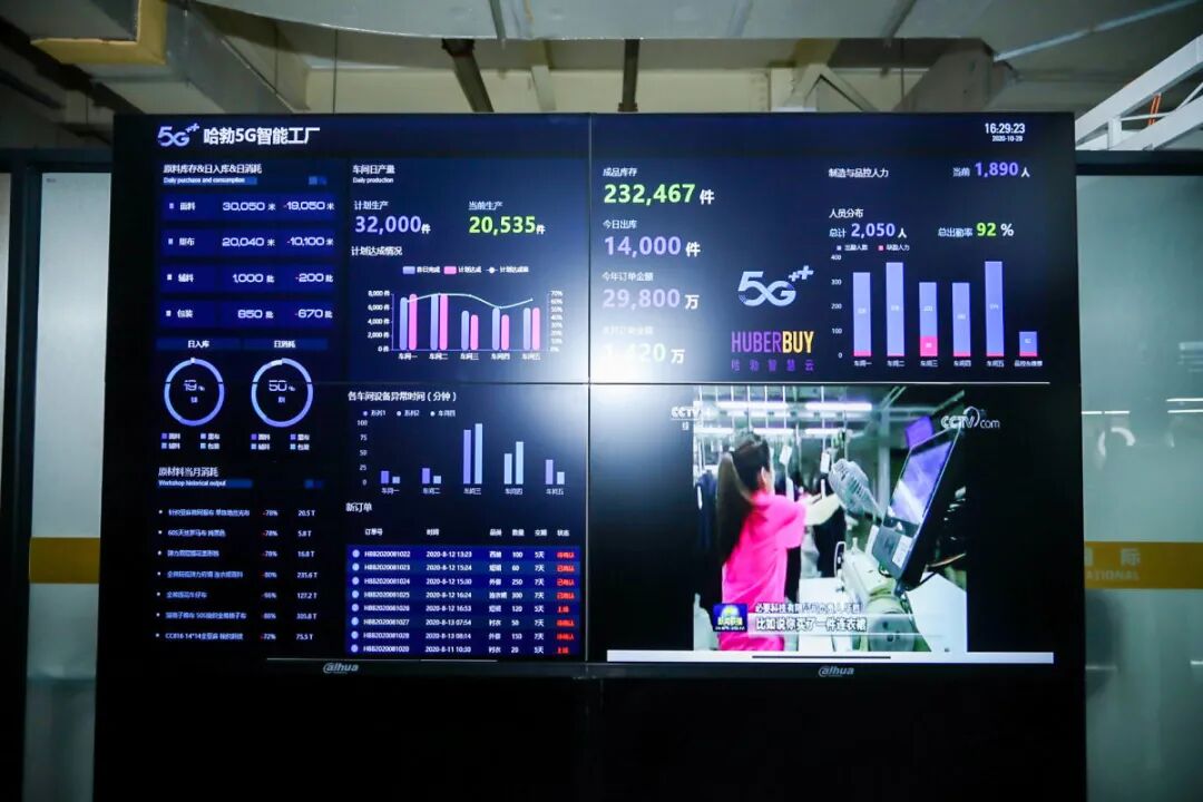 在汉帛工厂2楼的成衣制造车间,入口处摆着一组超大尺寸的高清屏幕,出货量、良品率、订单变化等数据在不停地跳动着,这就是5G+生产现场可视化系统。