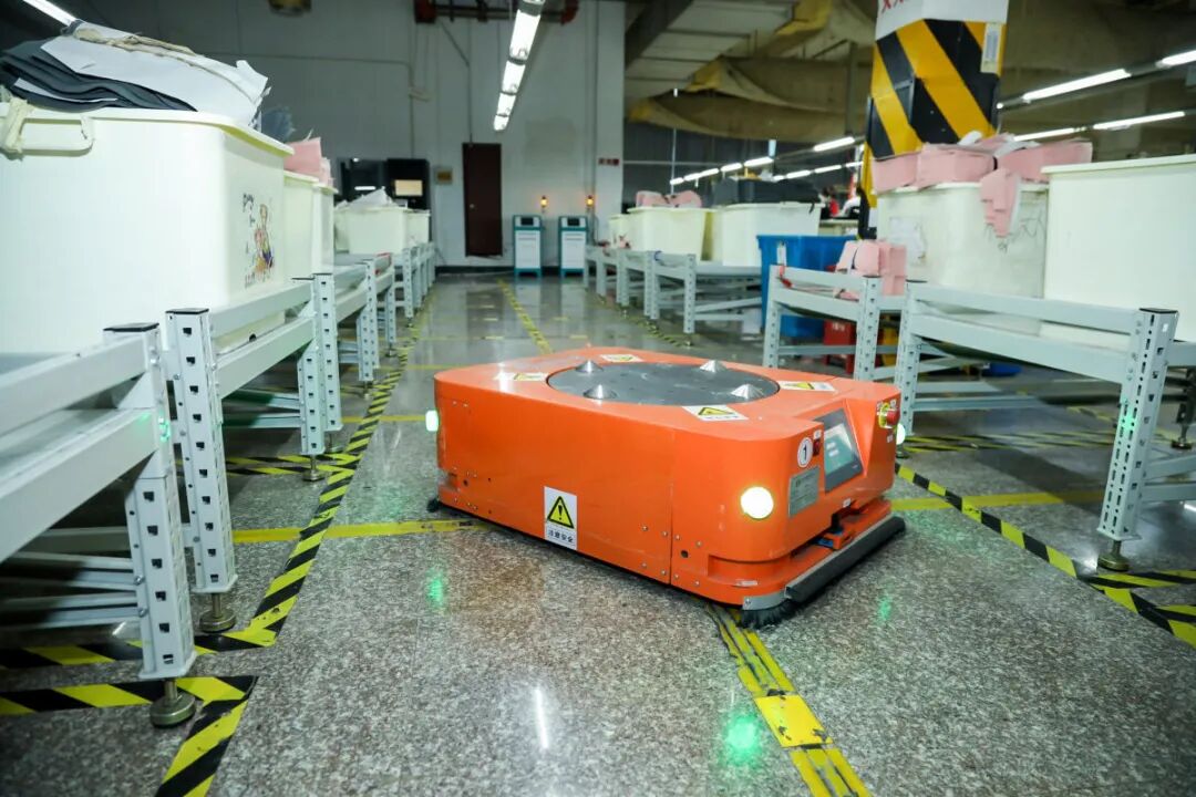在车间里,我们还看到了一台台小型机器人在指定的路线上忙忙碌碌地穿梭着,如果遇到经过的行人,机器人会自动停下避障,并以最高的效率将面料分门别类运送到指定的工位上。