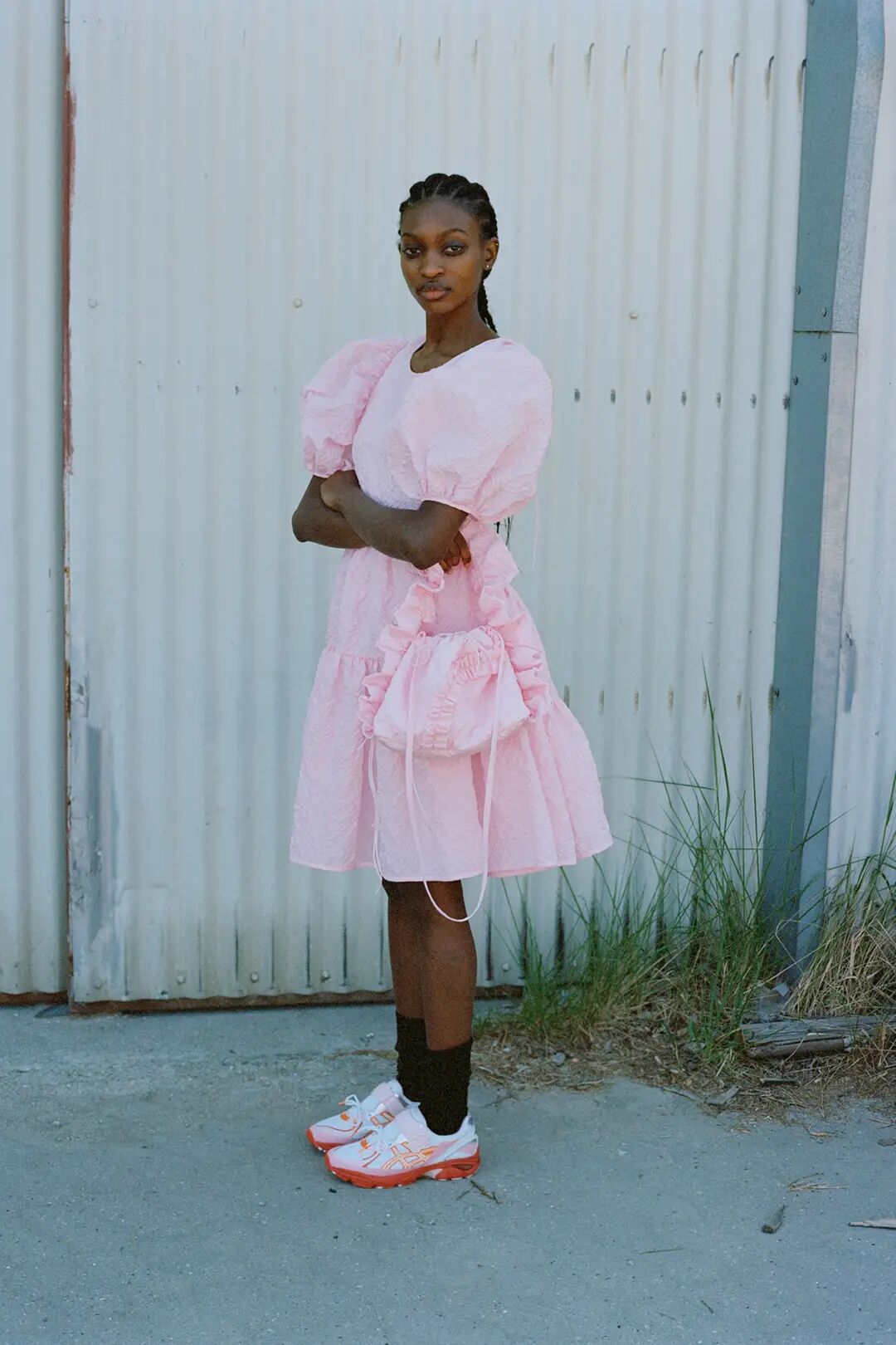 露肩连衣裙露出纤瘦的锁骨,夸张泡泡袖打造宫廷风穿搭,俏皮公主既视感。