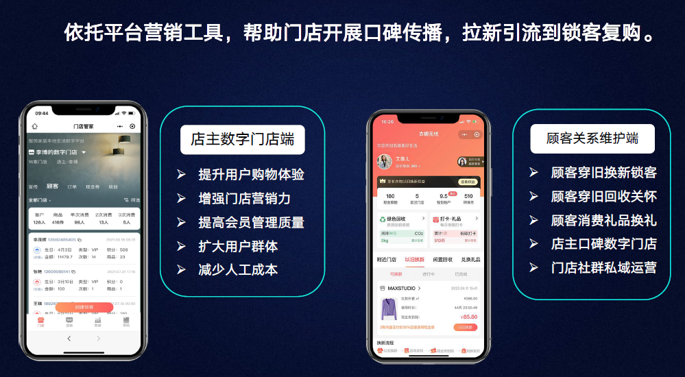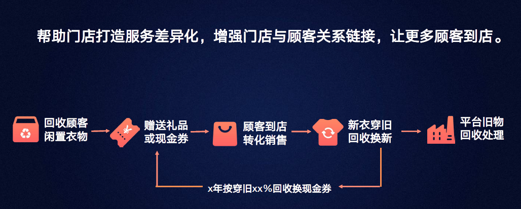 我们倡导绿色循环消费的生活态度,携手行业实体门店,为顾客提供衣物以旧换新帮助顾客解决闲置处理烦恼 和 降低新衣消费成本同时,增强门店与顾客的关系链接,让更多顾客到店,实现门店可持续营收增长。