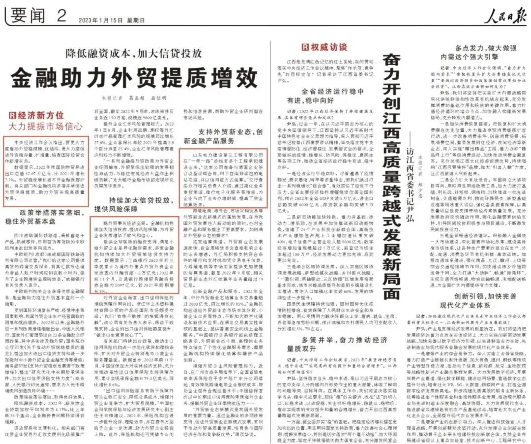 2023年1月15日,《人民日报》刊发了《降低融资成本,加大信贷投放 金融助力外贸提质增效》报道,其中“支持外贸新业态,创新金融产品服务”篇介绍了交通银行创新金融服务,助力外贸企业展业事例。目前,交行已在全国10个地区落地12个跨境电商、外贸综合服务、市场采购贸易等多种外贸新业态服务方案,覆盖京津冀、长三角、粤港澳大湾区、成渝经济圈等重点区域,为小微外贸客户提供便利的跨境资金结算服务, 有效解决了小微商户大批量、多笔数小额收结汇难题,提升了企业资金使用效率。2022年度,10家分行跨境电商、市场采购平台、外媒综合服务平台三项新业态业务量282.11亿元,同比增长507.23%。