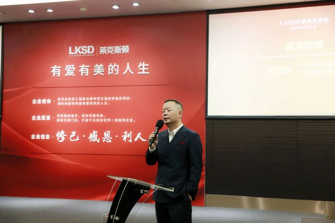 活动开始,广州市政协委员、广州服装行业协会会长 王志峰先生发表致辞。首先,王志峰先生代表广州服装产业,对各位在百忙之中前来参加活动的会员以及同行朋友们表示热烈的欢迎和衷心的感谢。他表示,今天一进场,就感受到“有爱有美的人生”的企业文化,对广州市莱克斯顿服饰有限公司精心准备的活动主题和场地布置表示由衷的感谢和高度的赞扬。