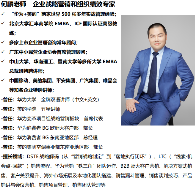 本次授课中,何麟老师结合华为三十多的人才管理实践经验,从“道-法-术-器”各个层面深度解密华为人才管理之道,旨在帮助民营企业实现从“人治”到“法治”,系统性解决面临的人才管理的“七不”难题,并打造一支 “力出一孔、利出一孔”、士气高昂、战无不胜的狼性团队!