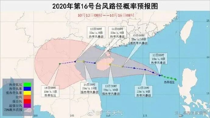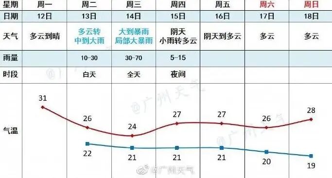 据@广州天气,第16号台风移近广东带来暖湿气流,加上同期北方冷空气南下补充,一冷一热两支气流在广州上空碰撞,13-14日将有大雨到暴雨局部大暴雨的降水过程,15日起降水减弱。