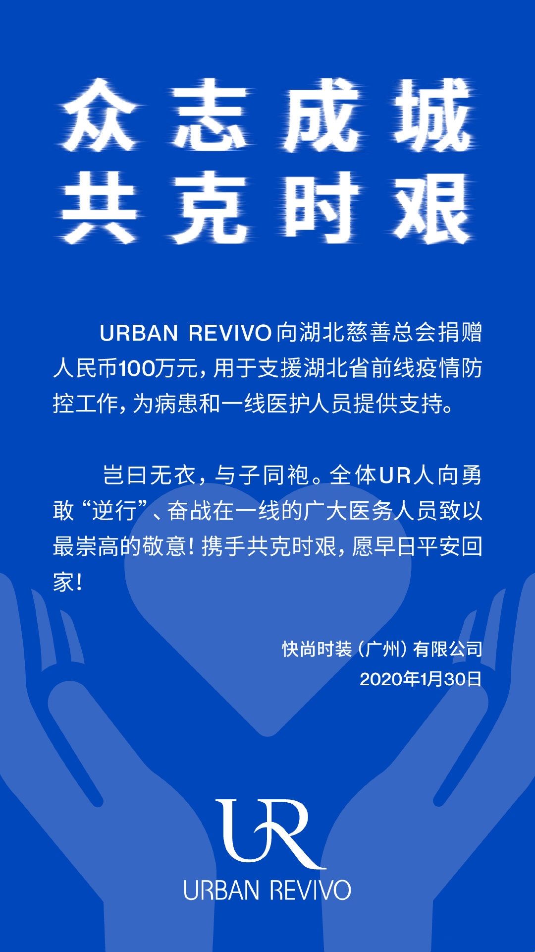 为此,广州服装行业协会执行会长单位URBAN REVIVO快尚时装(广州)有限公司向湖北慈善总会捐赠人民币100万元,用于支援湖北省前线疫情防控工作,为病患和一线医护人员提供支持。