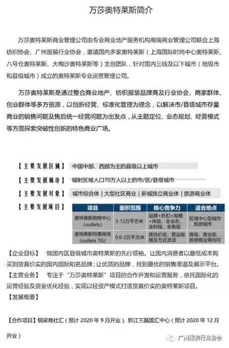 据介绍,万莎奥特莱斯是以上海纺织协会、广州服装行业协会为依托,集合众多设计师品牌、潮牌、国际/国内名品,以创新经营模式在国内三四线城市发展。除铜梁区外,万莎计划在万州区和黔江区分别部署一座标准奥特莱斯商场,占据渝东南、渝东北、渝西三个主要区域中心作为万莎在重庆的整体战略布局。