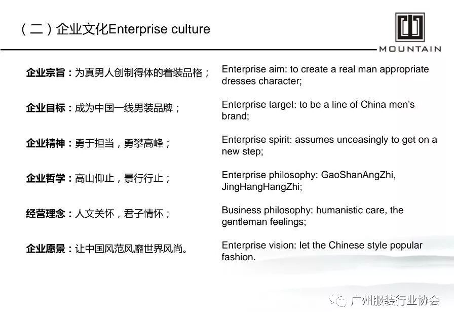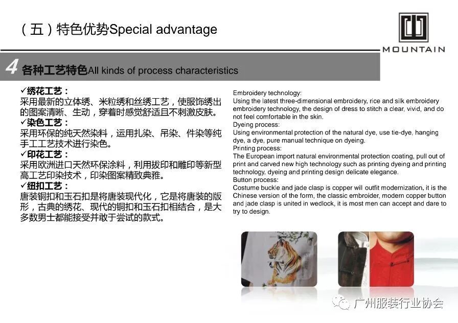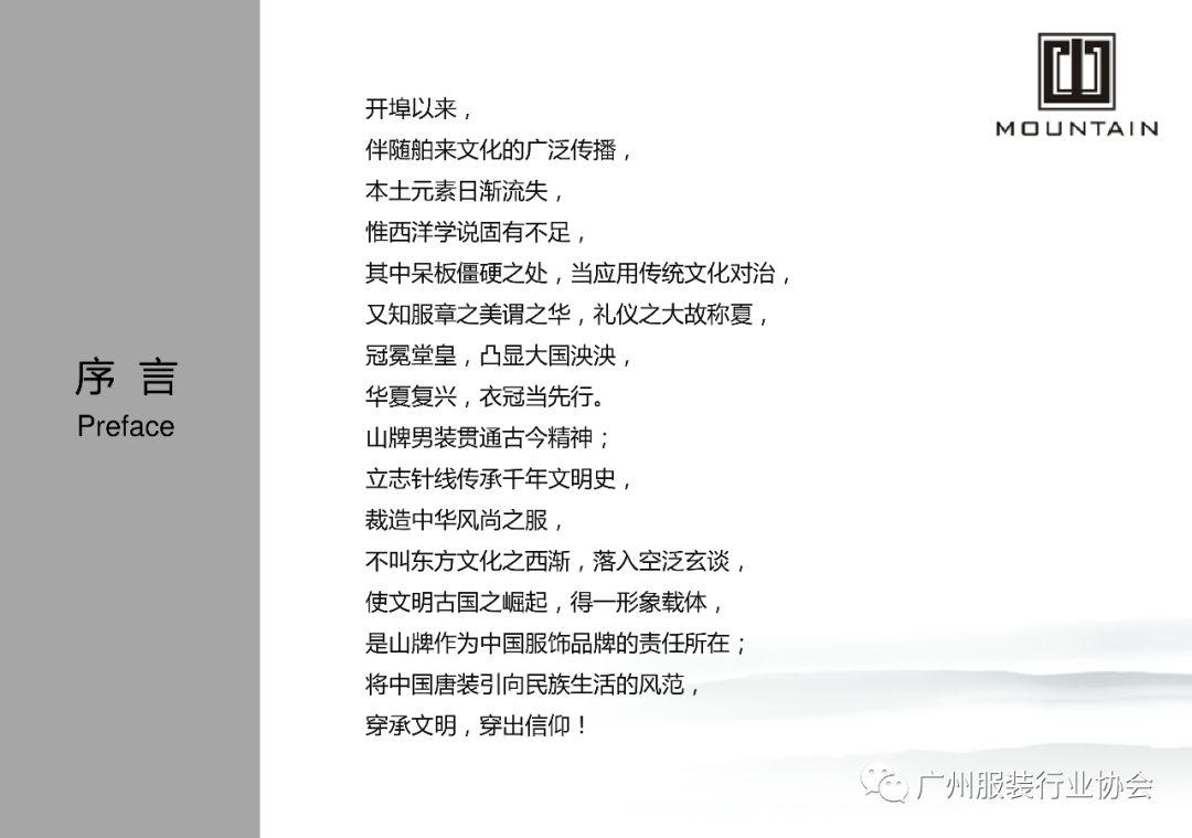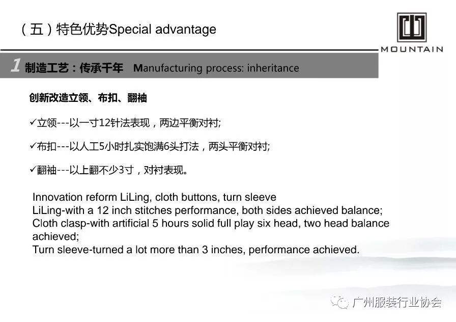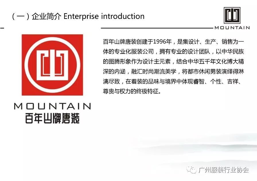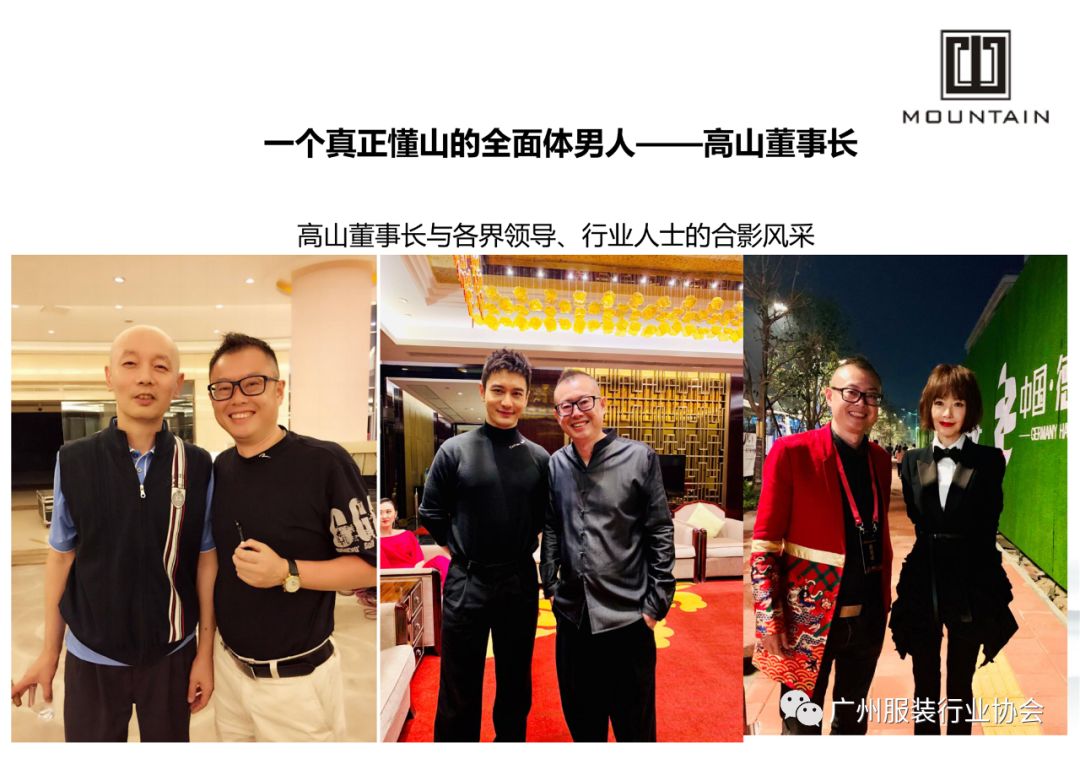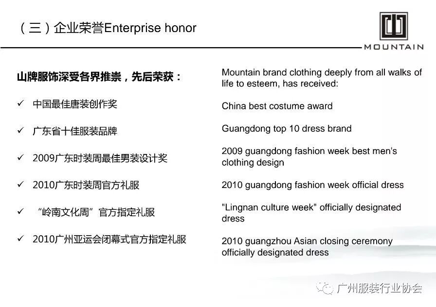 首先,高会长从企业简介、企业文化、企业荣誉、产品体系、特色优势及发展机遇等方面详尽地阐述了山牌服装的品牌综述。山牌服饰深受各界推崇,先后荣获:中国最佳唐装创作奖,广东省十佳服装品牌,2009广东时装周最佳男装设计奖,2010广东时装周官方礼服,“岭南文化周”官方指定礼服,2010广州亚运会闭幕式官方指定礼服。