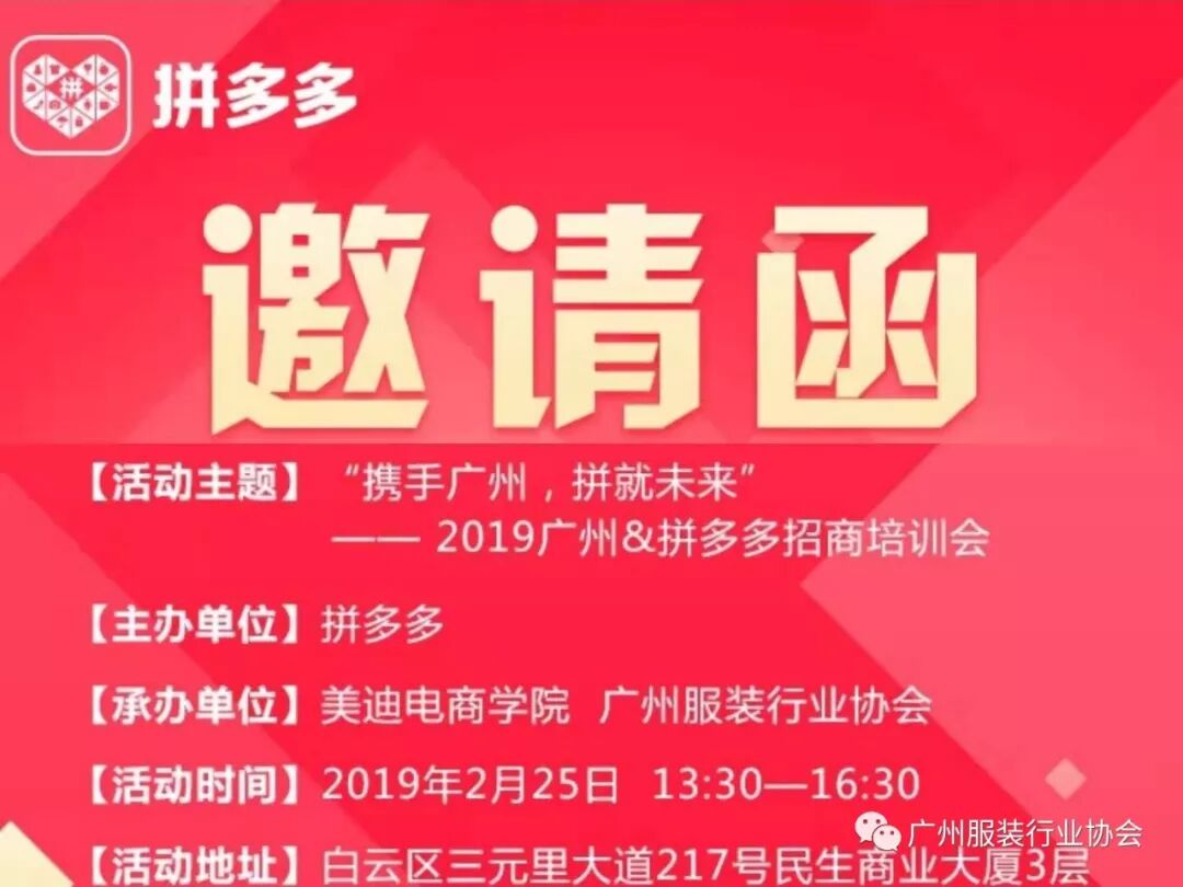 2月25日,广州服装行业协会携手美迪电商学院,成功承办了“携手广州,拼就未来”—2019广州&拼多多招商培训会。