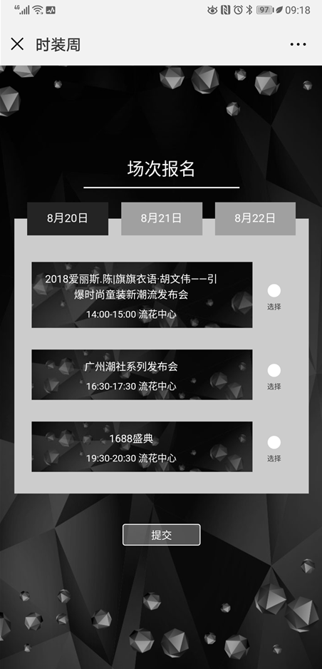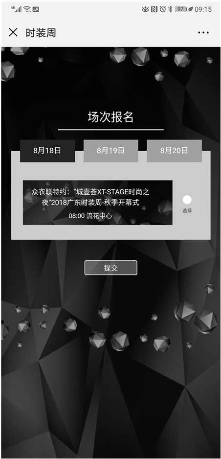 ★各场次门票申请截止时间为演出时间的前一天,例如8月18日的时装周开幕式,门票申请截止时间为8月17日;