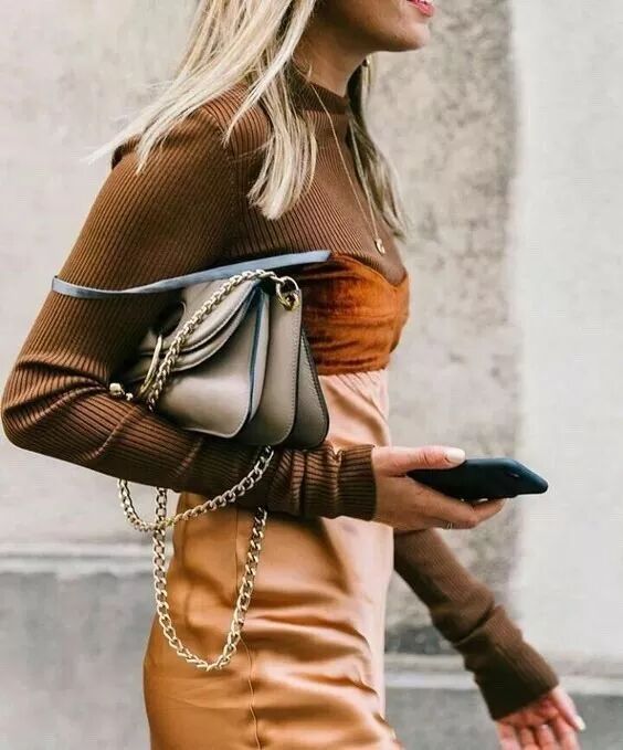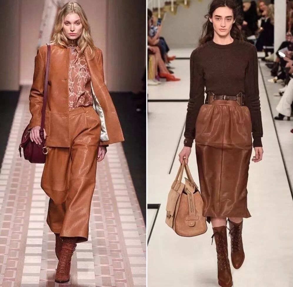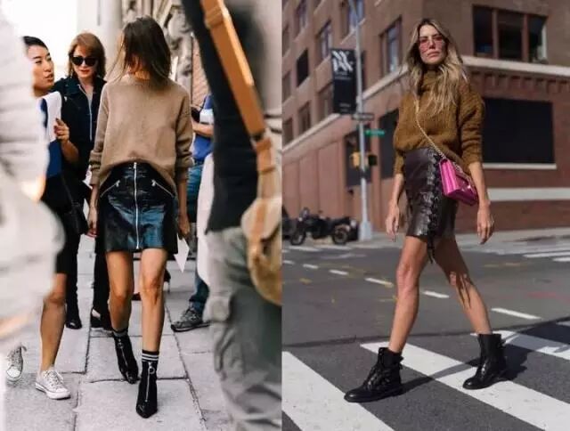 面料柔和的焦糖色针织单品搭配皮质小短裙,柔软与酷帅结合,俏皮中带点小野性,也是小女人装扮的一个个性打开方式。