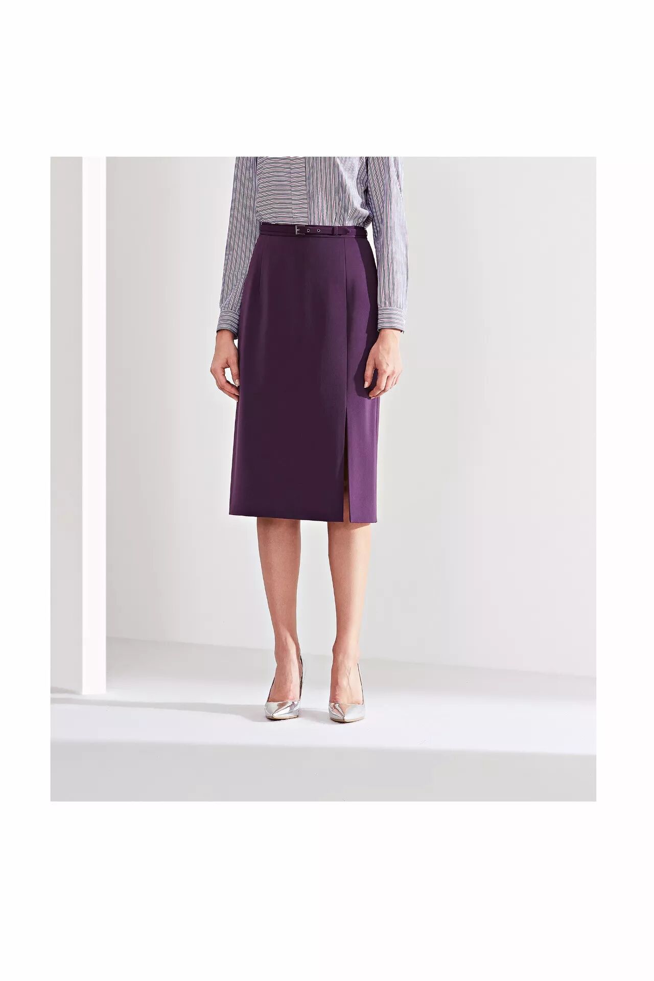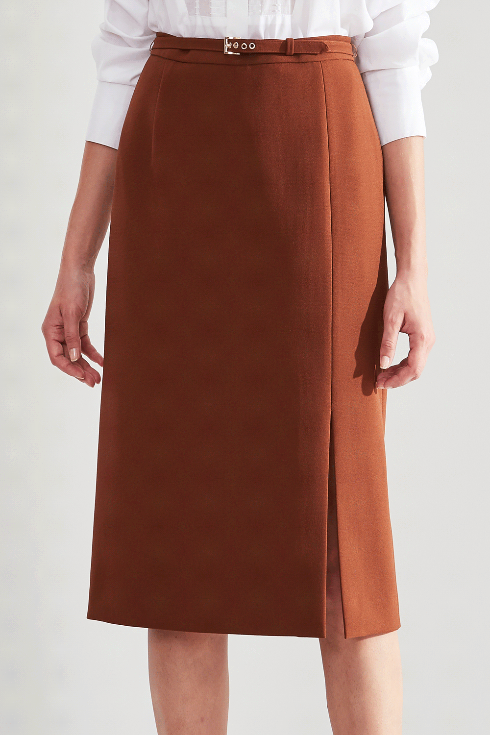 此款开衩裙采用挺阔的面料并着以今年的主流色彩——焦糖色。流畅的直身廓形,使整个LOOK简洁大气,高级感强。搭配同材质的系腰带,尽显优雅的女性魅力。