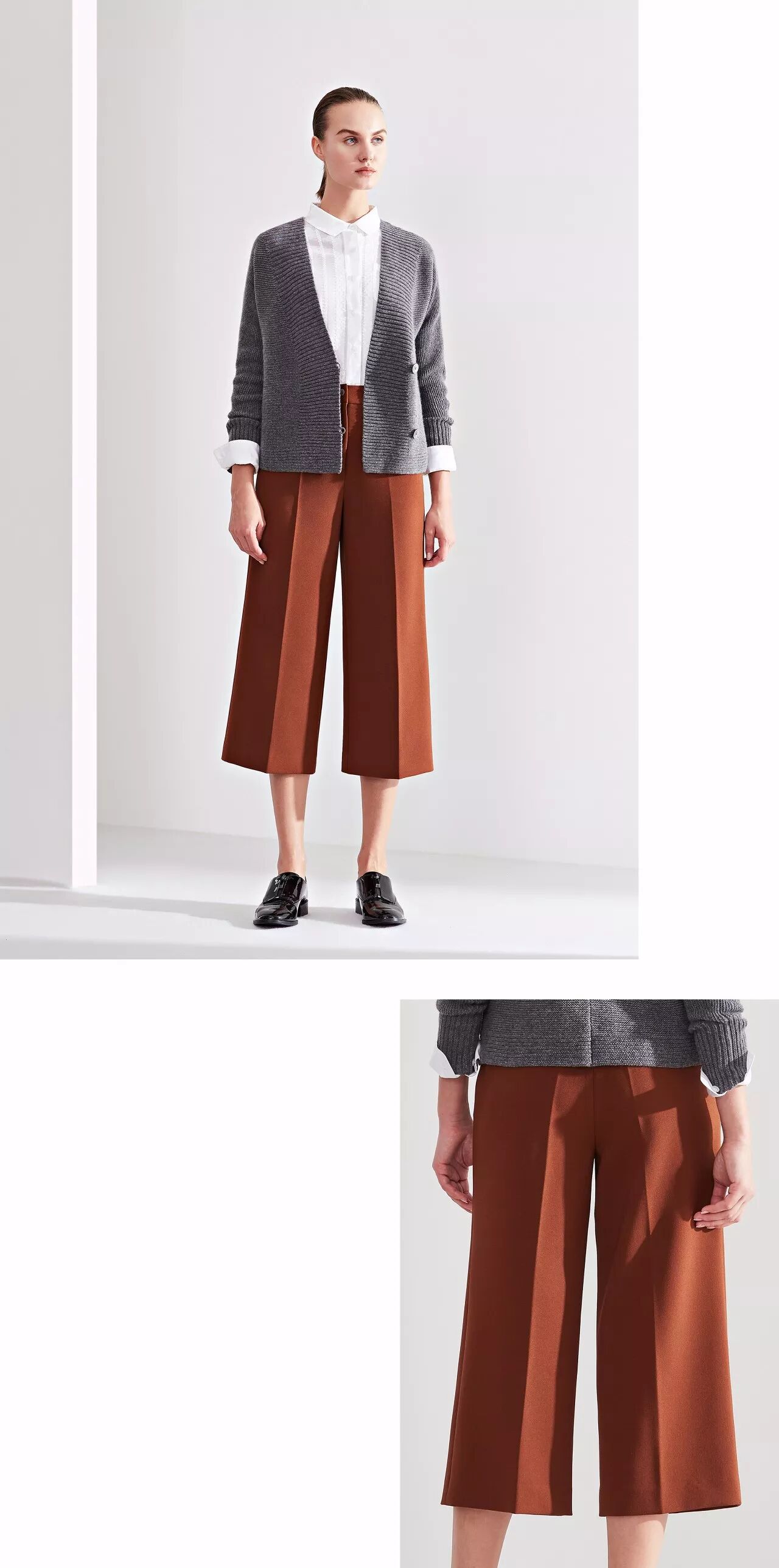 此款八分阔腿裤,面料挺括,穿着的包容性极强,搭配性广。暖暖的焦糖色,沉郁醒目却又不张扬,搭配黑白灰上衣,让基础色不再平庸,干练又率性,轻松hold住职场风。