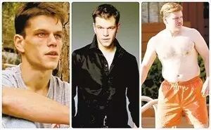 为了演艺事业爆肥暴瘦是达蒙常干的事,左图是马特·达蒙出演《生死豪情》,右图是马特·达蒙出演《告密者》,每天都是大量汉堡、比萨加黑啤,增重30磅以上。