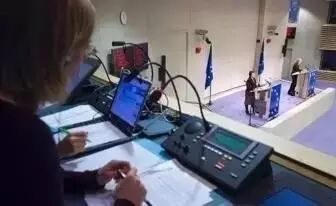 专业的会场口译:备有纸笔、电脑、话筒,译员在同传室内戴耳机边口译、边观察会场情况。就算资深译员,在同传过程中也需要用笔记下数字、专有名词等关键信息。毕竟同传要注意力高度集中、超级烧脑!所以打开应该是这样的: