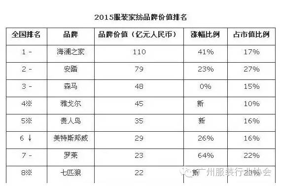 胡润研究院发布的《2015胡润品牌榜》,海澜之家品牌价值为110亿元人民币,品牌价值比去年增长41%,占市值比例17%,成为国内首个品牌价值突破百亿元的服装品牌。