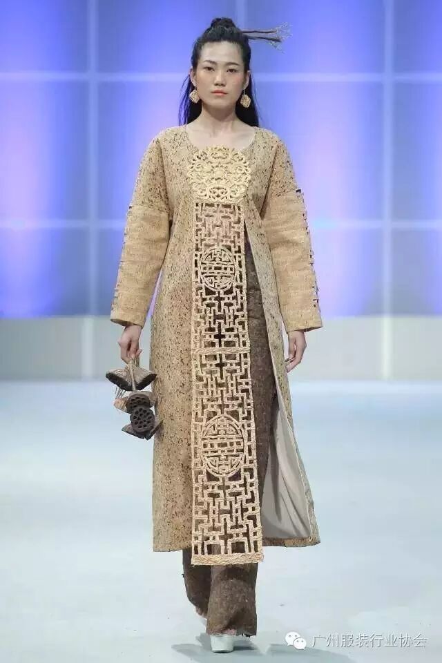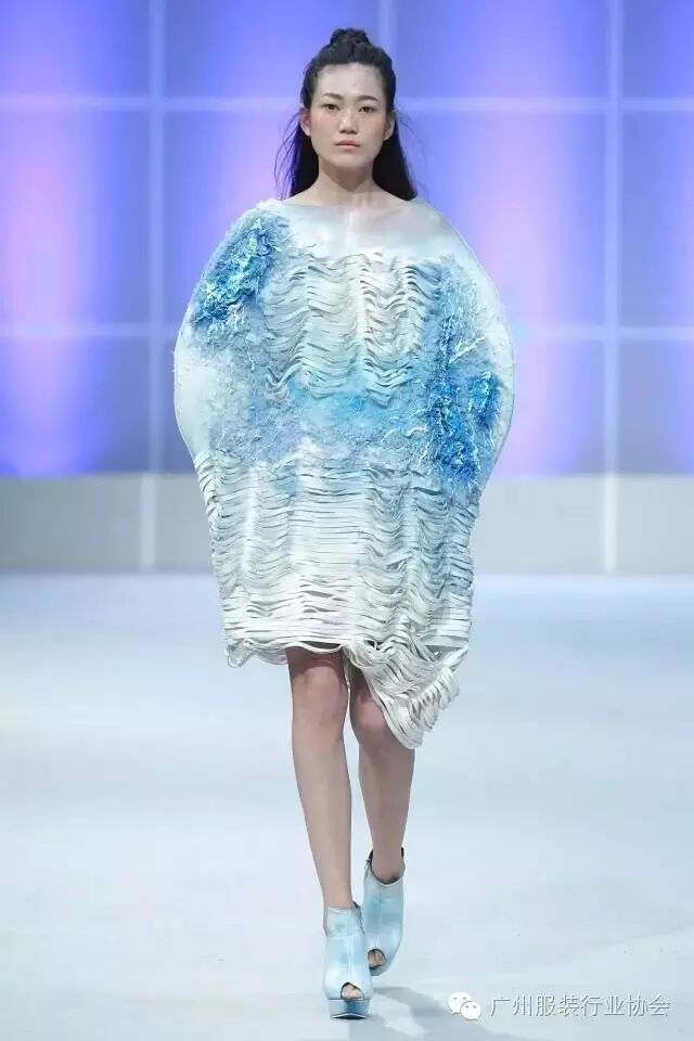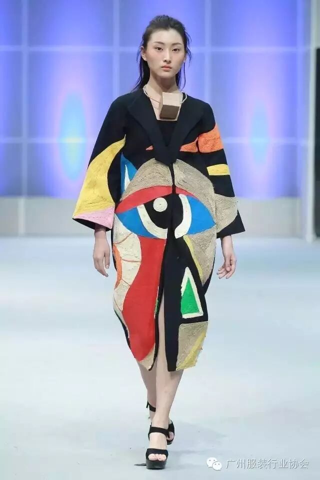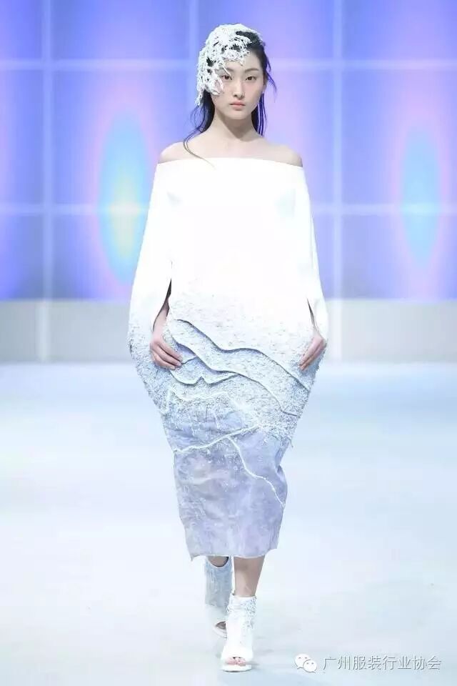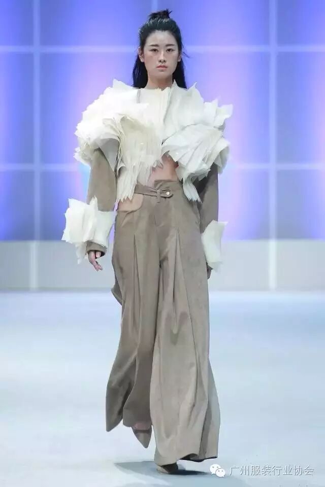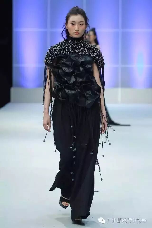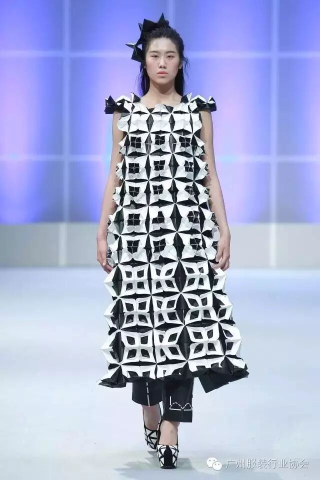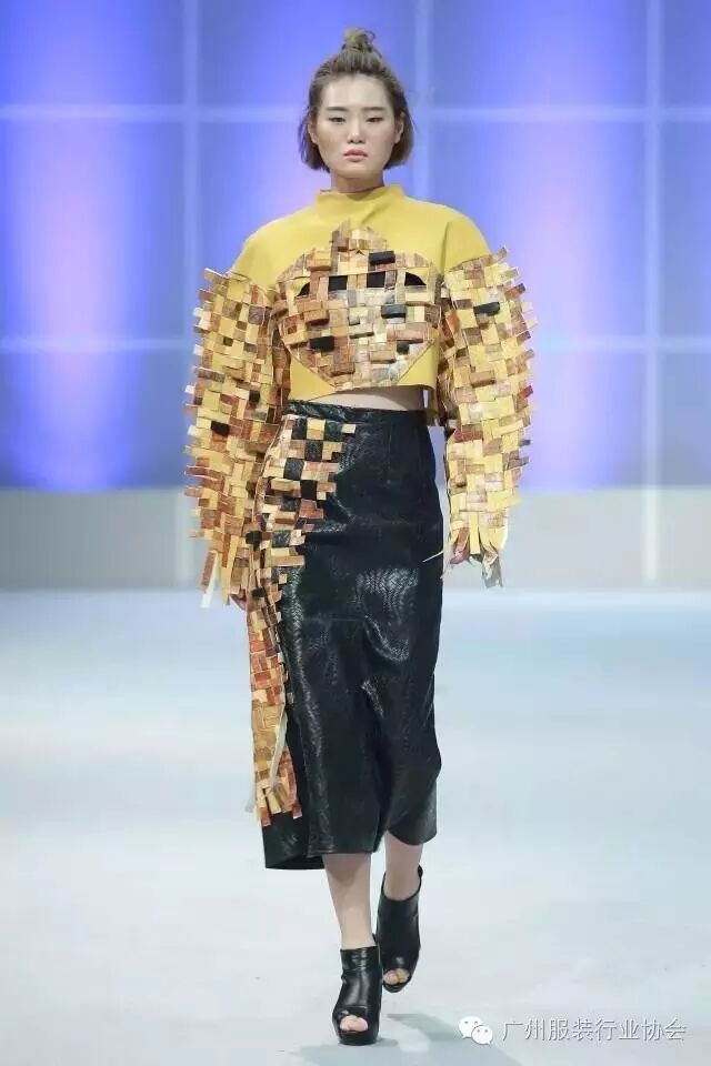本次汇演的学生作品,有很多侧重于面料改造的方式方法运用,比如镂空、浮雕、编织、手绘、非服用材料的使用等等。多从传统和文化中撷取灵感,譬如独具岭南特色的窗花,广东的早茶文化,中华民族的云纹图案,民间传统的门饰文化,红红火火的醒狮年文化,折纸艺术,大地肌理,洗衣店元素……都能信手拈来,变化制作成衣。