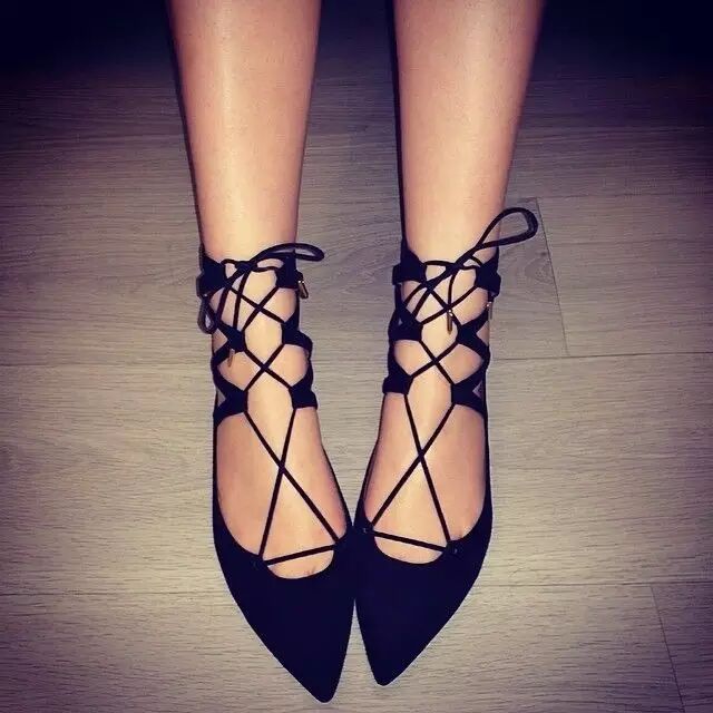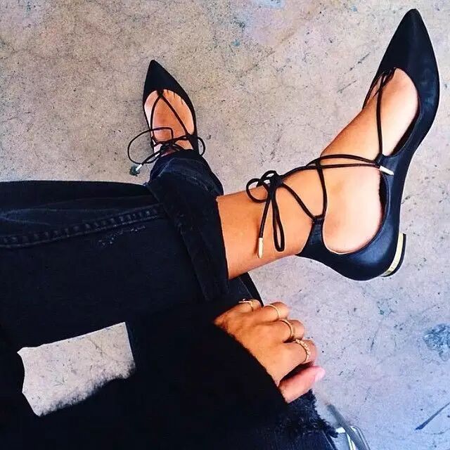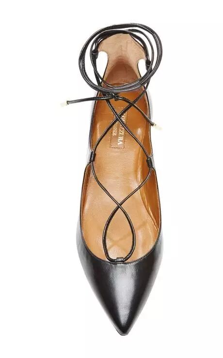 相比较绑带尖头鞋,可能有些人更喜欢这类型的平底鞋,脚踝处的系带处是修脚型滴,如果有些妹纸对自己脚踝的美感不太自信,也可以选择这款。