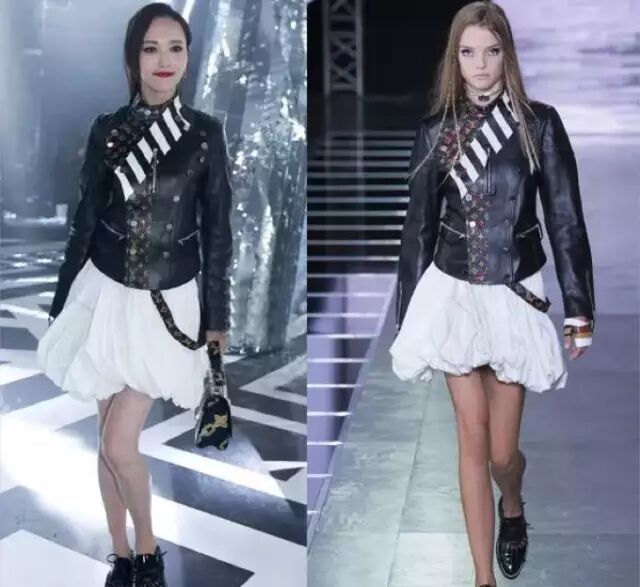 “不老女神”唐嫣 在LV秀场中身穿的是LV早春款,拼接型的皮革外套搭配甜美泡泡裙,更显时髦少女风,唯一的败笔就是唐嫣的妆容过于浓烈。