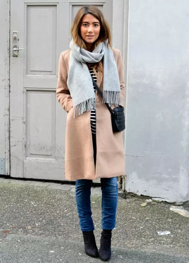 驼色大衣 + 灰色围巾