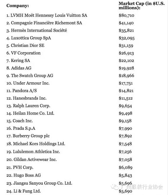 令人意外的是,前25强中出现了不少中国面孔。总部位于江苏江阴的海澜之家以 94.98 亿美元的市值排在第14名,处在Ralph Lauren和Coach之间。同样位于江苏的服装生厂商江苏三友集团也跻身排行榜;在香港交易所上市利丰有限公司(Li & Fung)紧随其后,位列第24名;榜单的最后一名雅戈尔集团也来自中国。1979年以服装起家的这家宁波公司如今市值达到56.61亿美元。