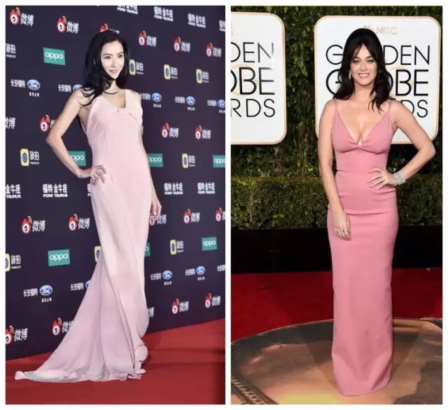 而2016流行色的粉晶已经有明星穿上身了,同为粉色,这一局柏芝姐姐胜出,还有点仙女的样纸~而右边的凯蒂·佩里(Katy Perry)把这粉色穿得粗糙,撇开身材不说,这身上的面料也有点廉价,头顶艾米·怀恩豪斯(Amy Winehouse)蜂窝状的复古长假发,累赘、黑压压,头重脚轻~水果姐呀,再怎么说这是金球奖红毯秀哦,不是你家开的睡。。。